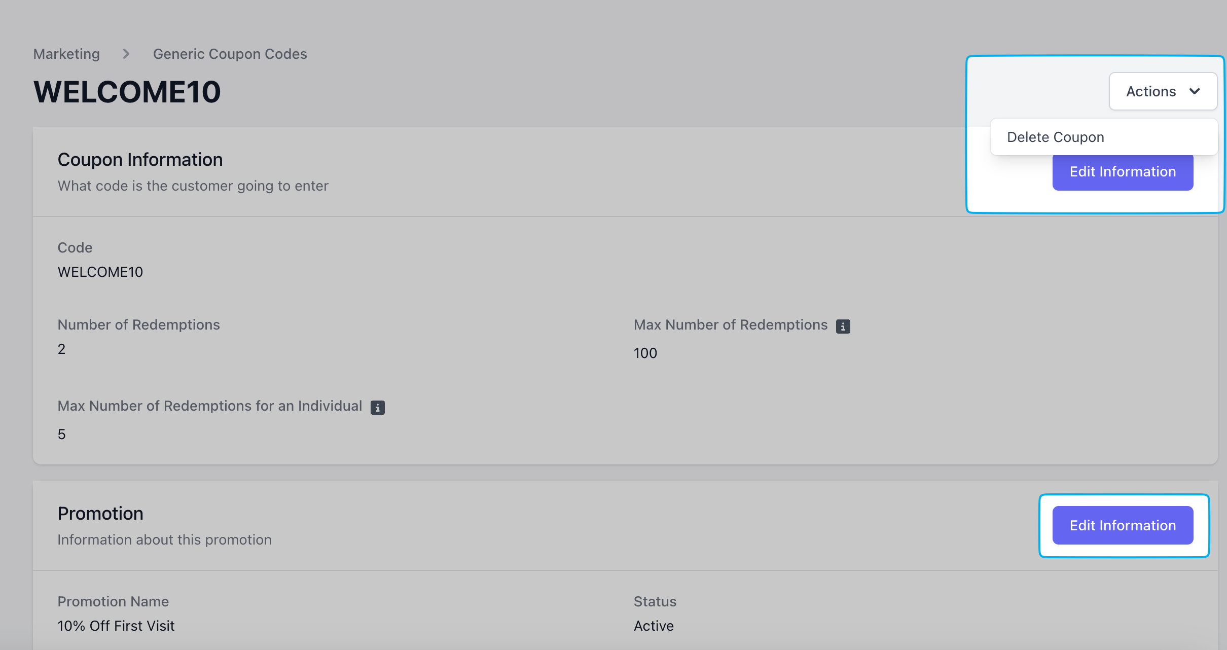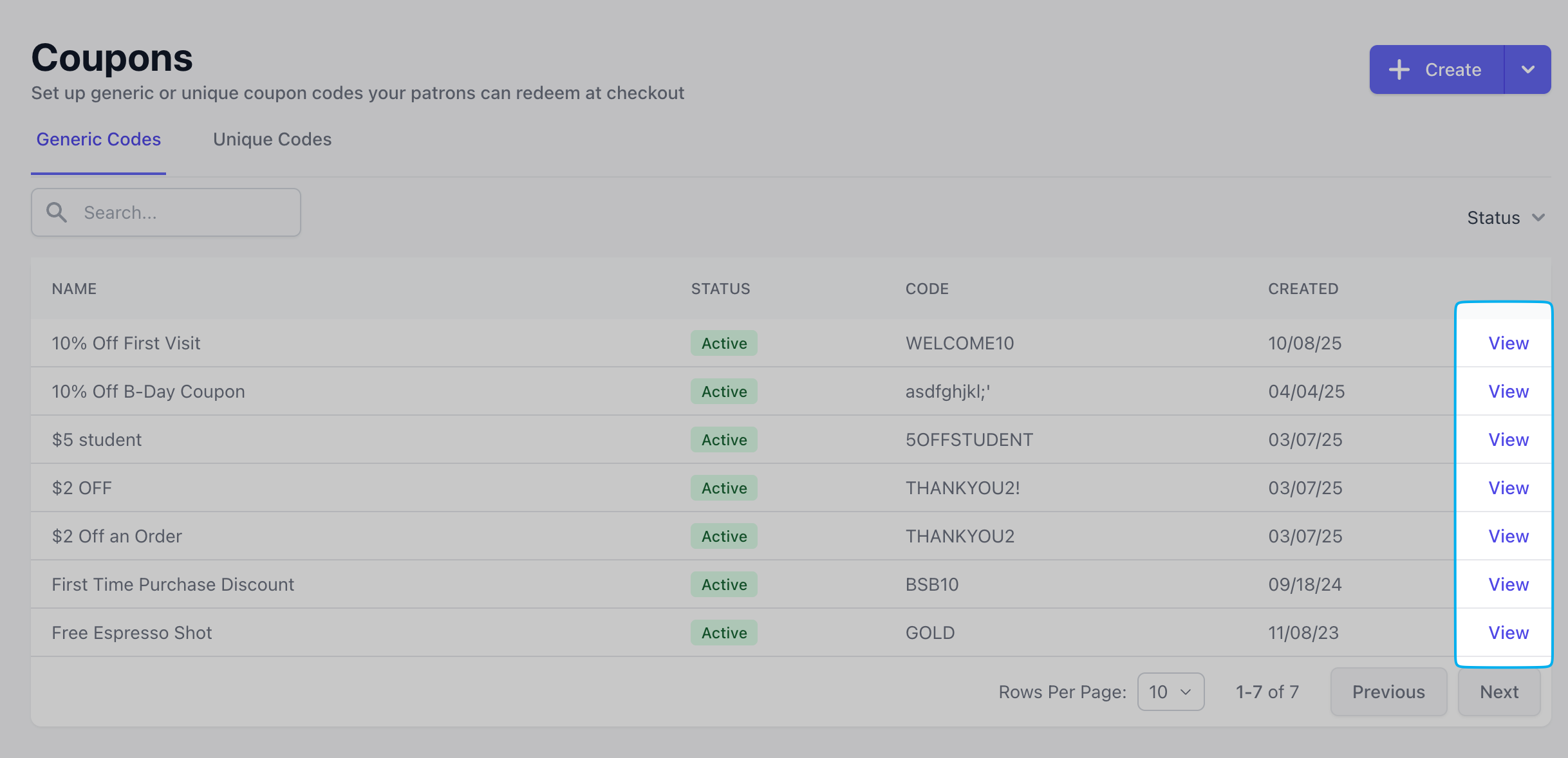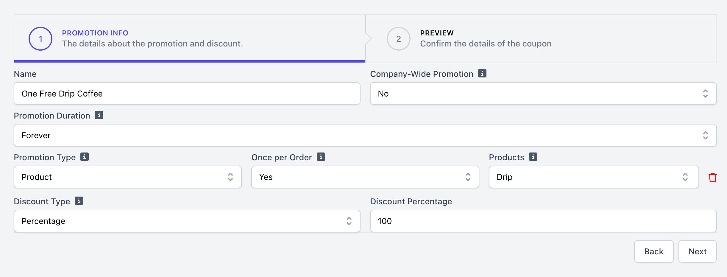 Preview all coupon details and click save to create. Coupons may be edited or deleted at any time.