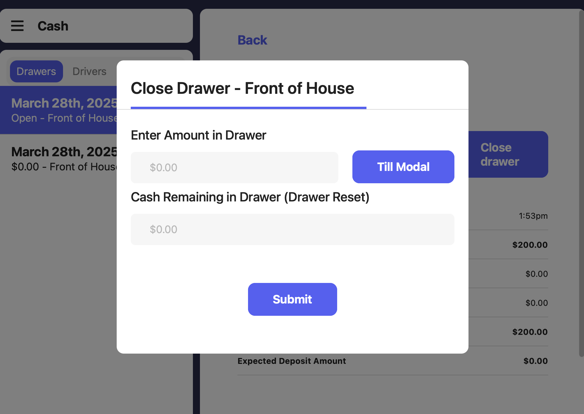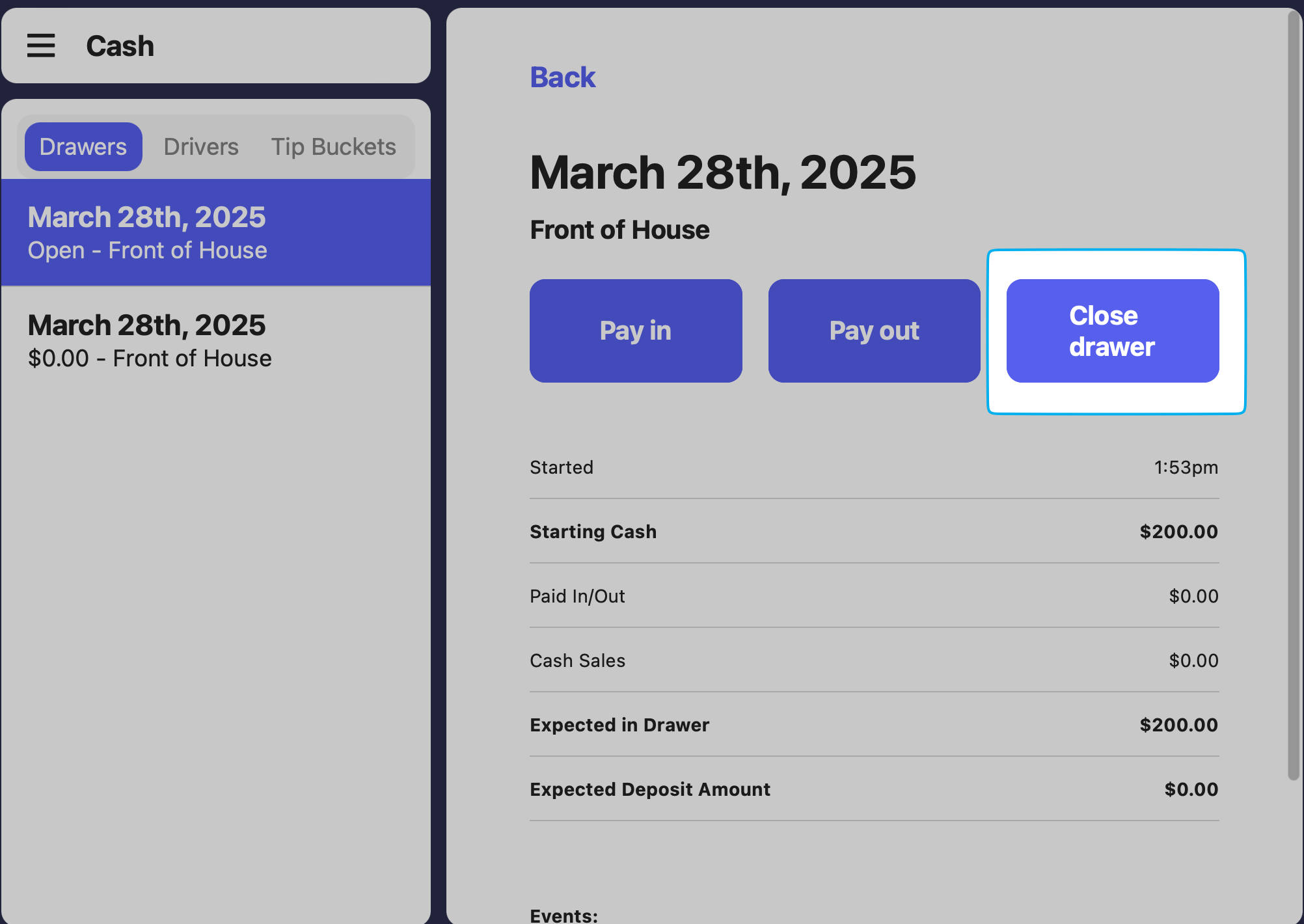 On the Point of Sale, press the tribar in the upper left screen corner > press Cash > press the open cash drawer > press Close Drawer