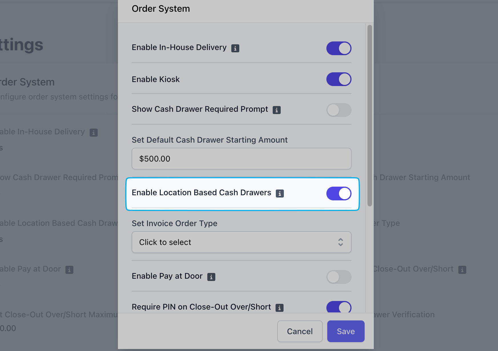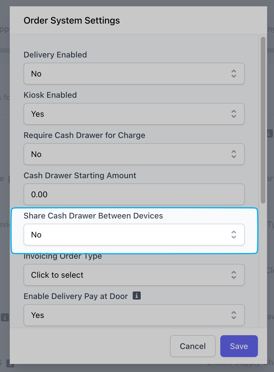 Order System > Edit > Share Cash Drawer Between Devices = No > Save