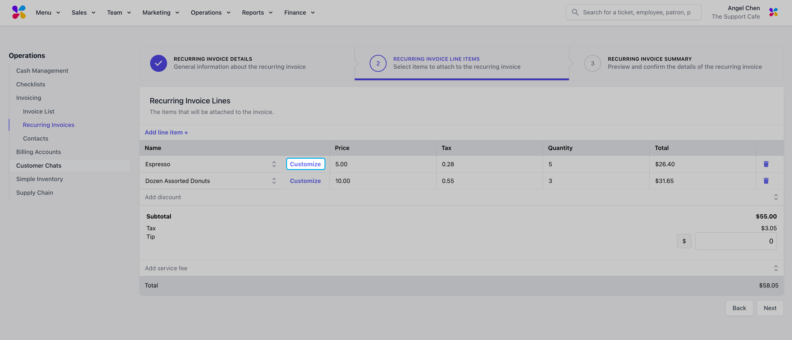 Use the Customize button to add notes, apply product discounts, or edit tax rates for the selected line item before clicking Next.