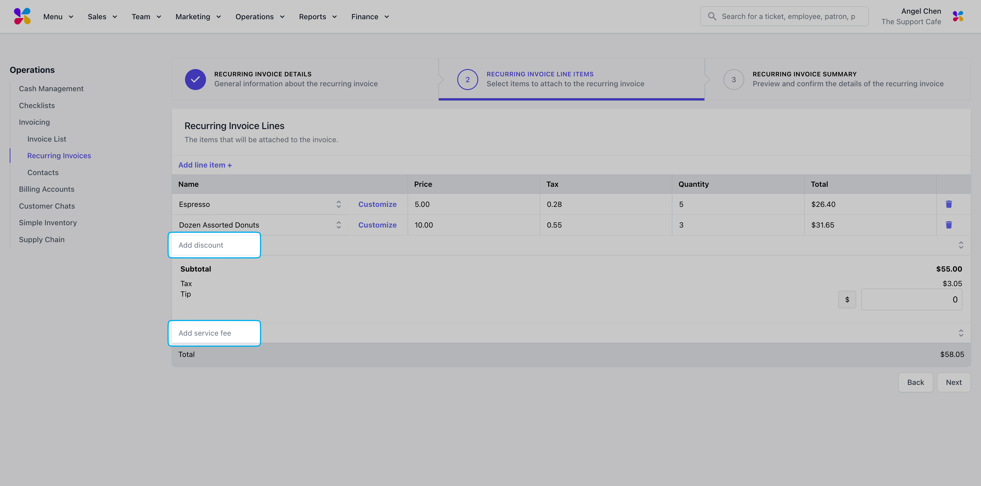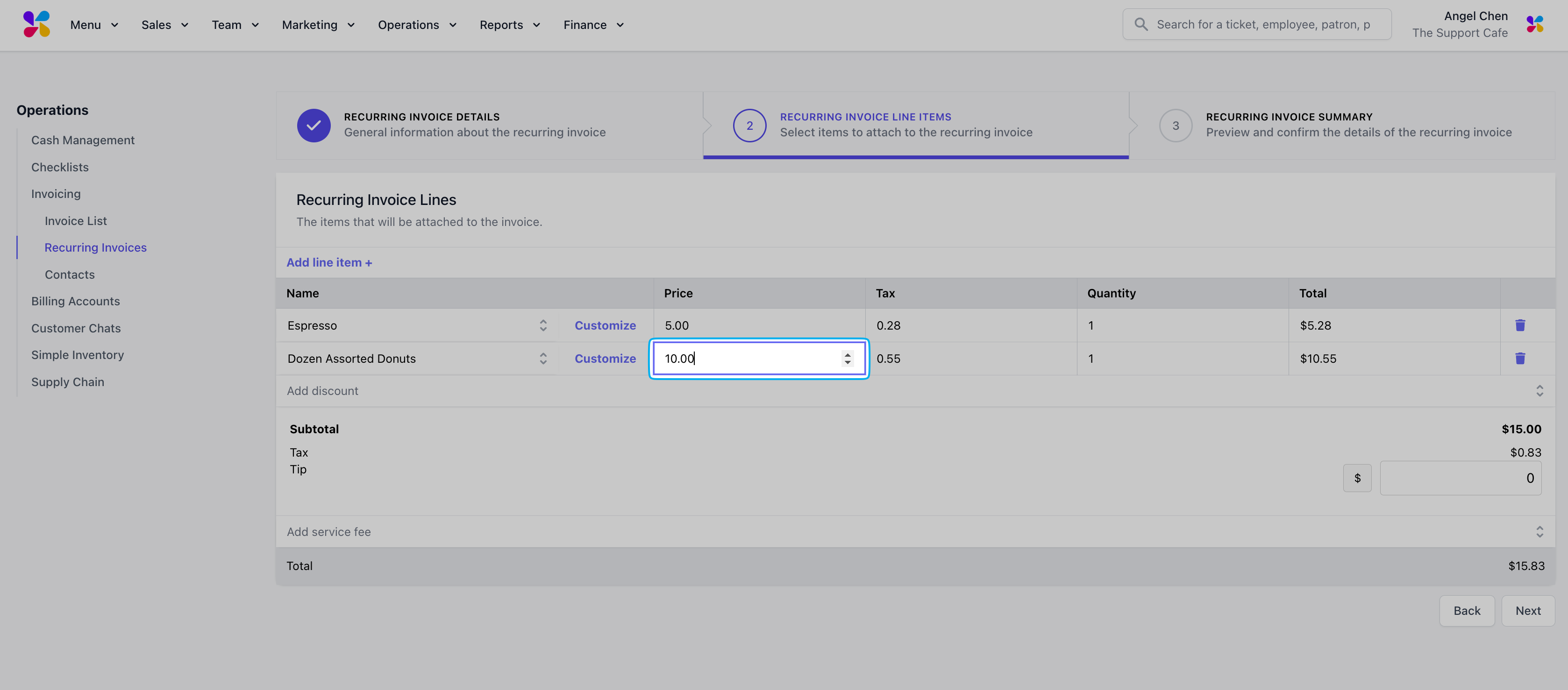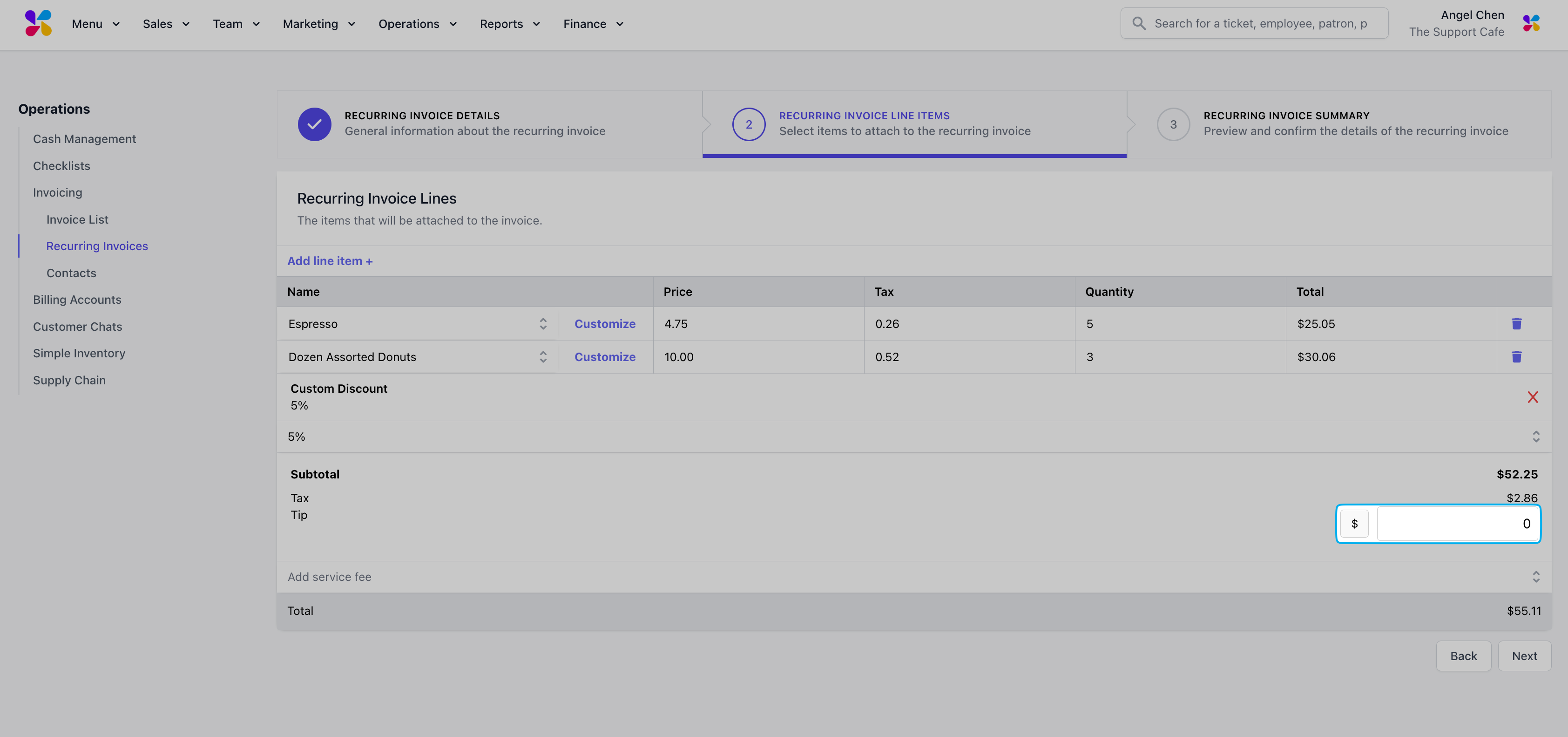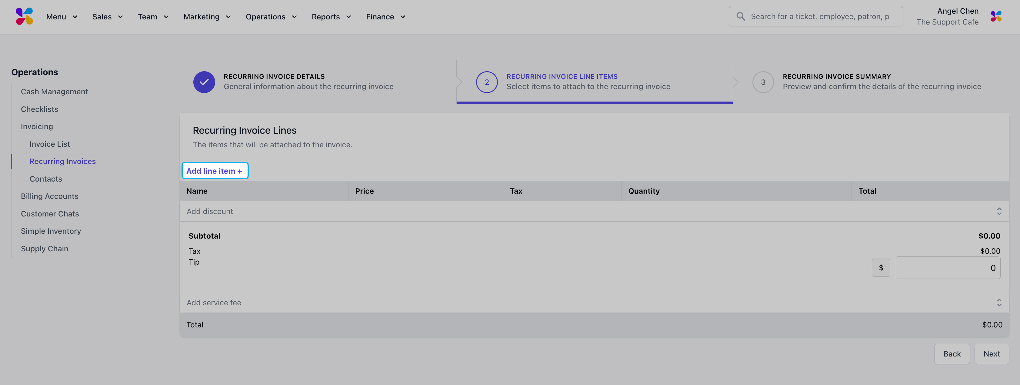 Input each invoice line item by using the Add line item + button. Add an existing menu item or create custom items for this invoice.