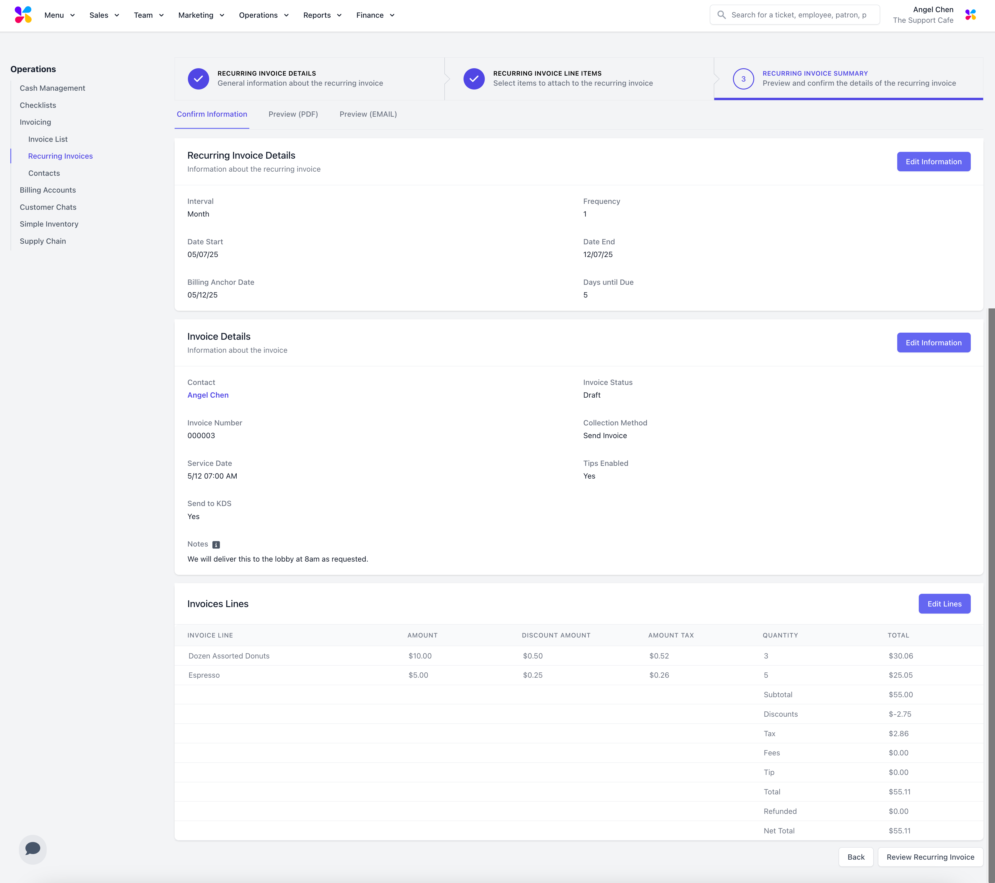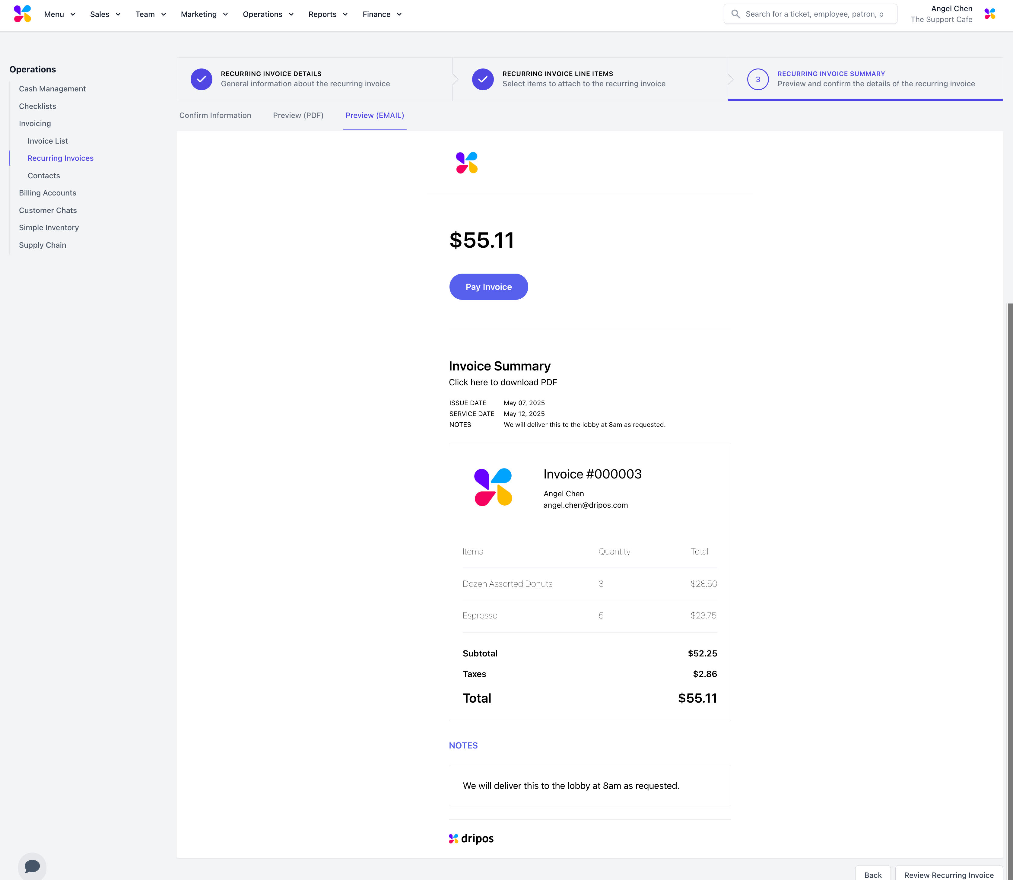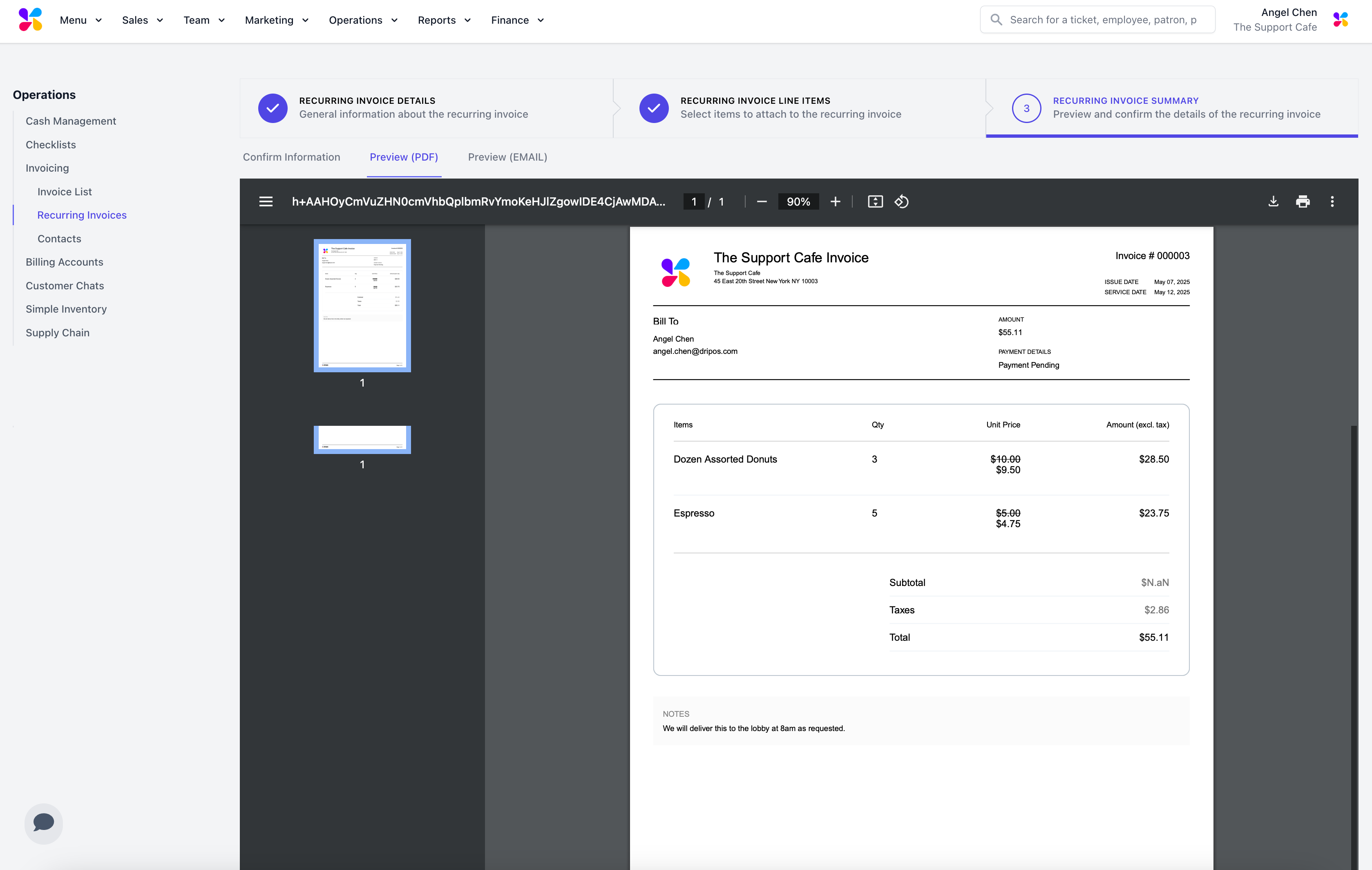Confirm the invoice information. Click on the Preview (PDF) or Preview (EMAIL) tab to see the exact invoice the customer will receive.