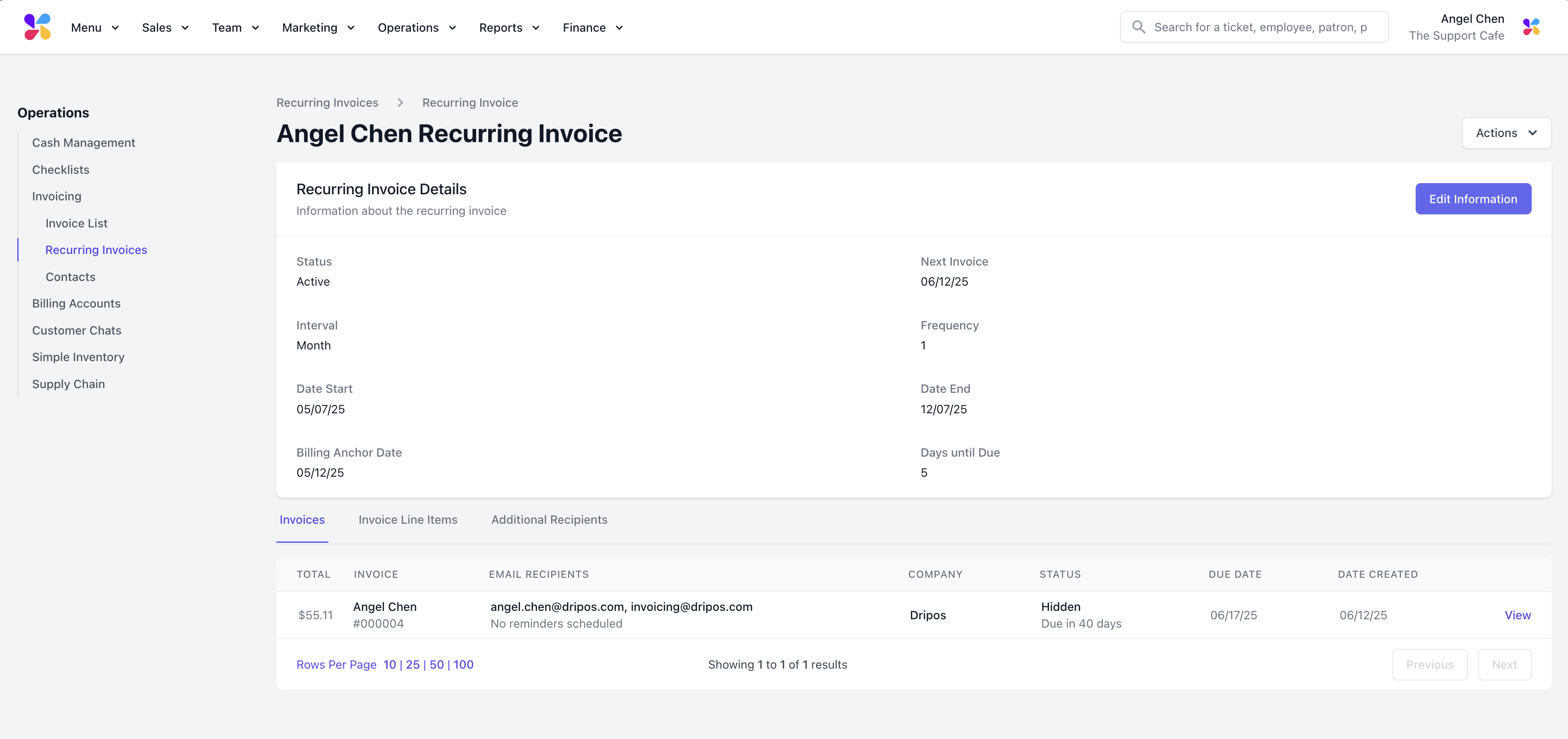 Once the contact is created, you can Edit Information on their page. To delete an invoice contact, use the Actions dropdown.