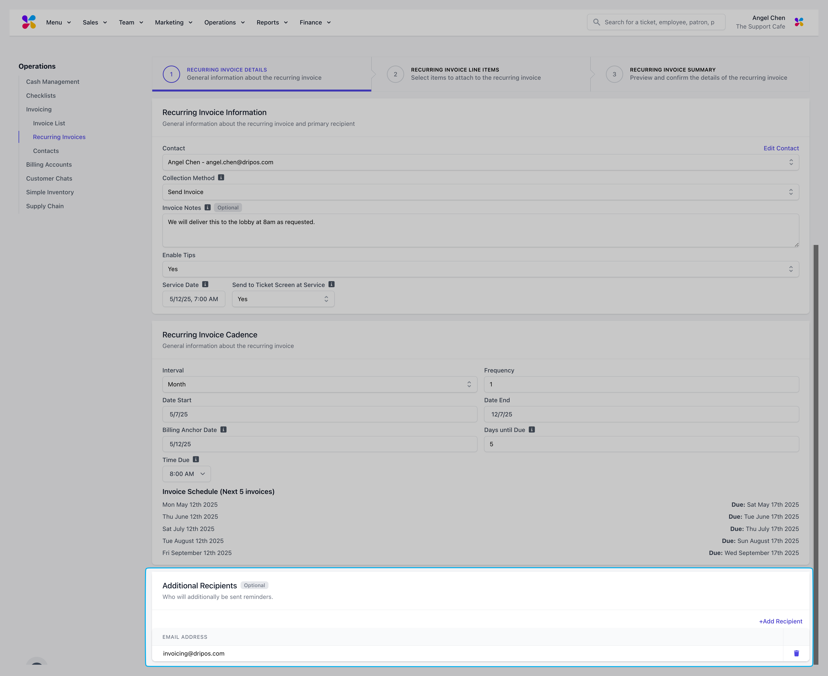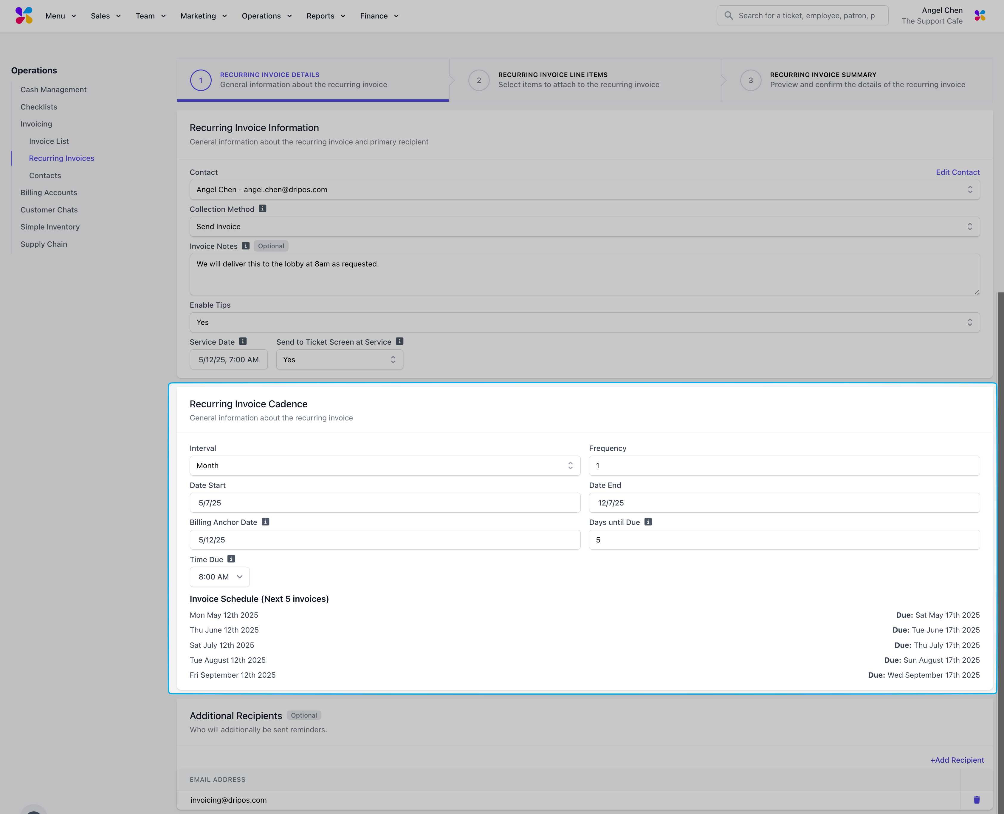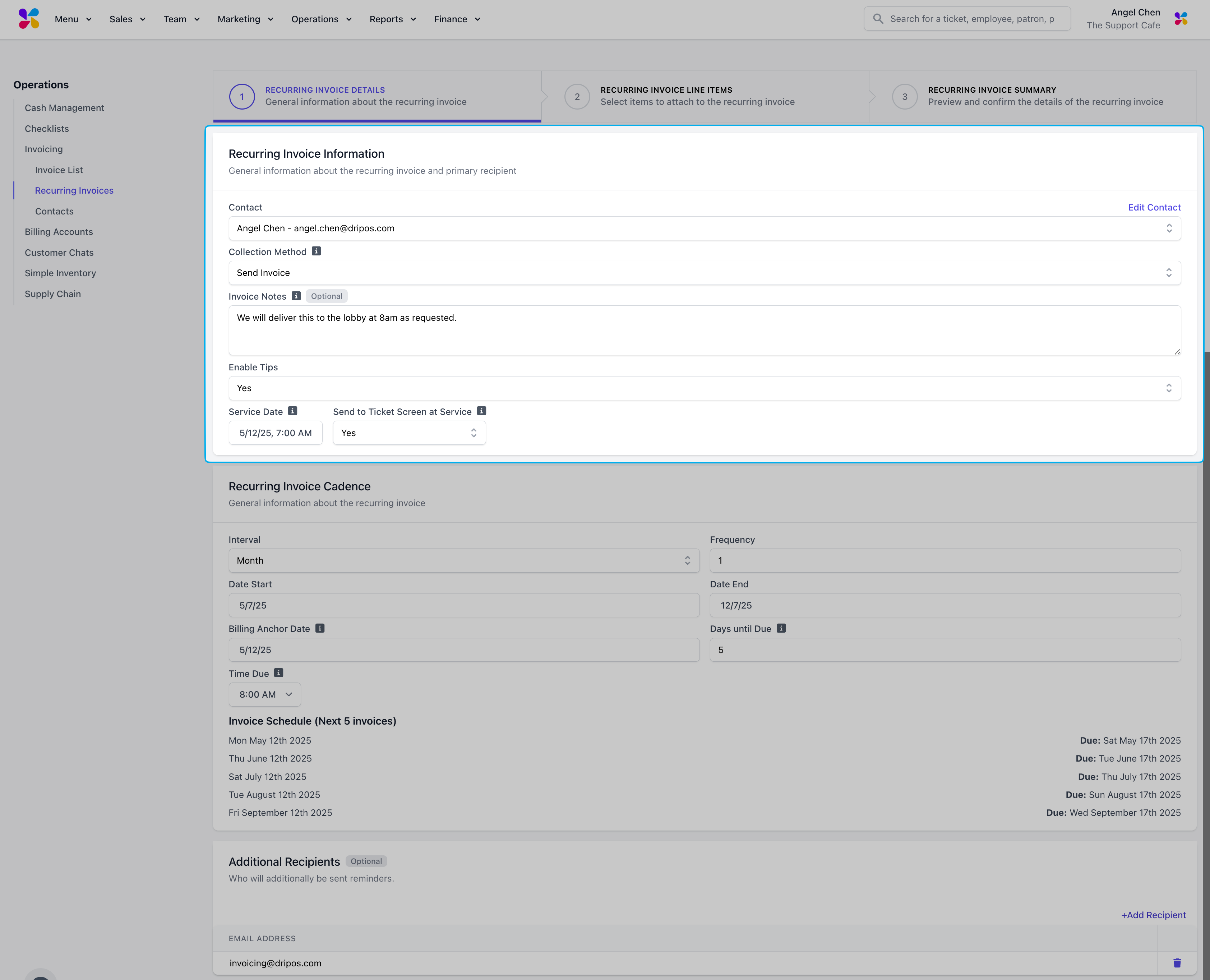 Contact: Click the dropdown to select an existing contact to assign this invoice. For new contacts, type in their name and select “Create Contact” to enter their information.Invoice Number: Input your preferred invoice number or use the auto-generated invoice numberDue Date: Assign a due date to the invoiceInvoice Notes (Optional): Include any notes to include in the invoice for the customerEnable Tips: If set to Yes, the invoice contact can include a tip when paying off the invoiceService Date: Select the date and time this invoice should be recorded as a sale for reporting purposesSend to Ticket Screen at Service: If set to Yes, the invoice line items will appear on the ticket screen of your POS on the selected service dateAdditional Recipients: Use the +Additional Recipients button to attach other emails to send the invoice and any payment remindersInvoice Reminders: Add invoice reminders by using the +Add Reminder button. Edit the frequency by changing the Days and the Occurrence setup (Before, On, After) in relation to the Due Date. Delete reminders by clicking the trash icon next to the unwanted reminder date