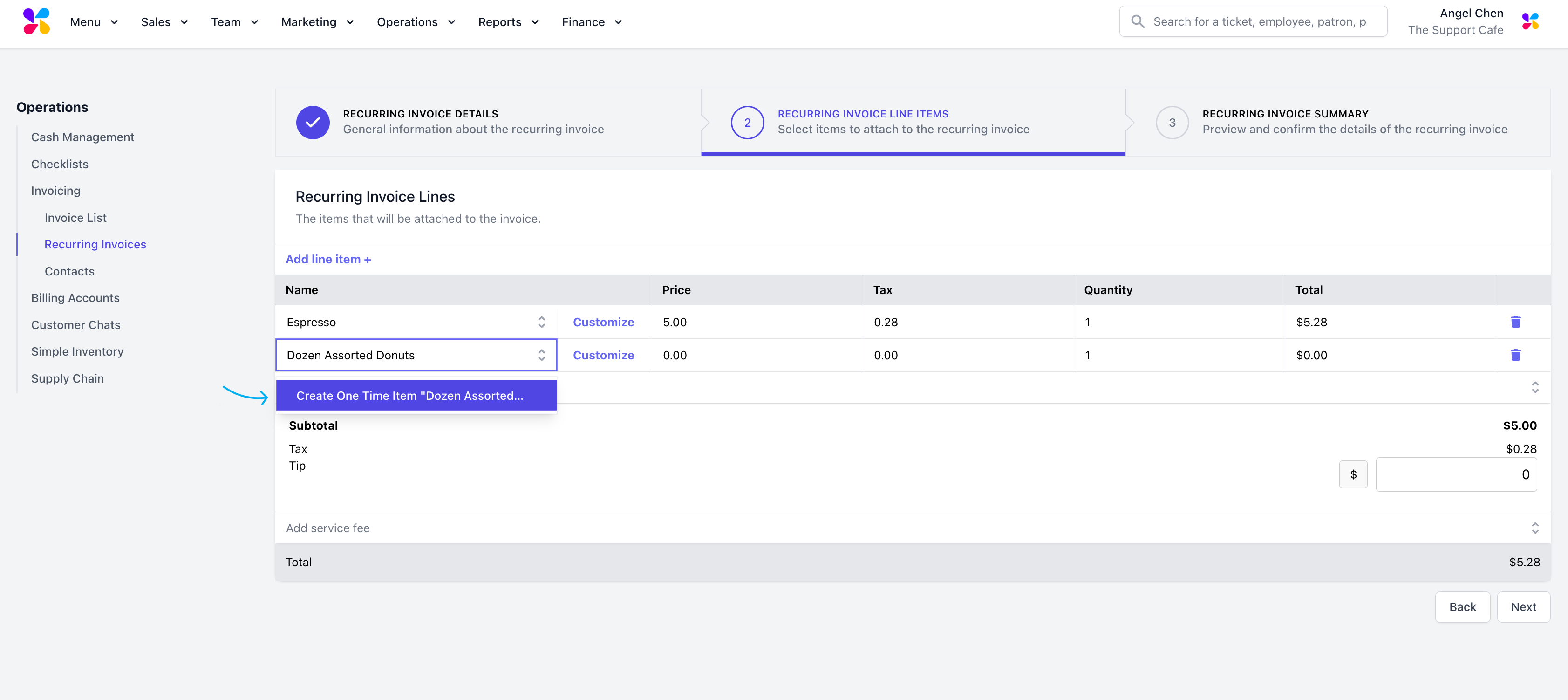 To add existing menu products, click the Add line item + button and type in the name of an existing product you would like to add. Select the corresponding product to add to the invoice.