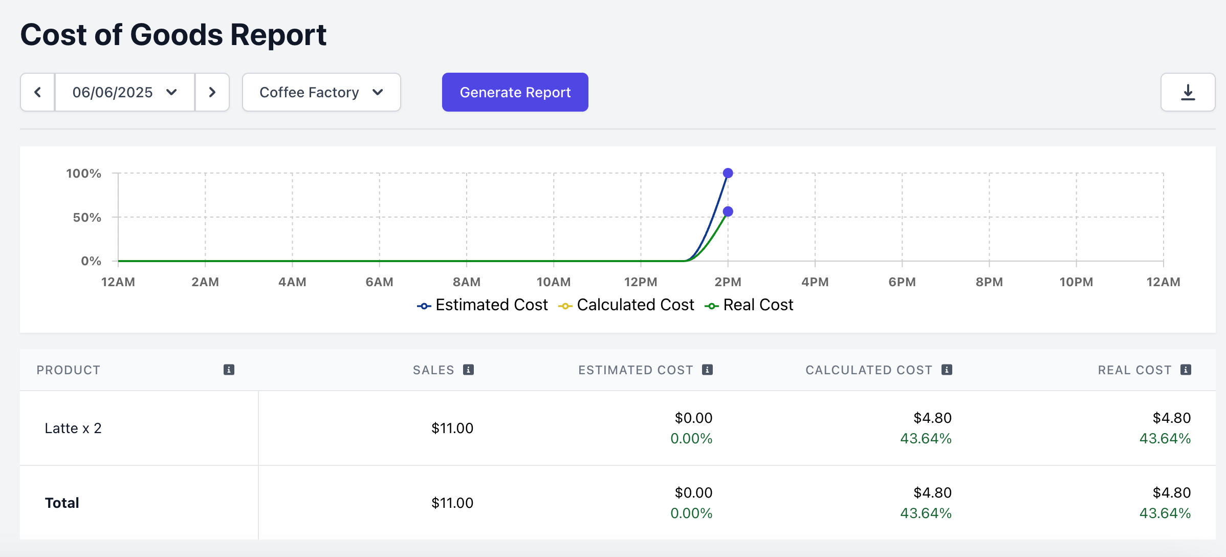 When a product is sold, it’s sale as well as the sale of those ingredients is recorded in the Cost of Goods Sold report.For example, a 12oz and a 16oz latte are sold today. The COGs report shows the following: