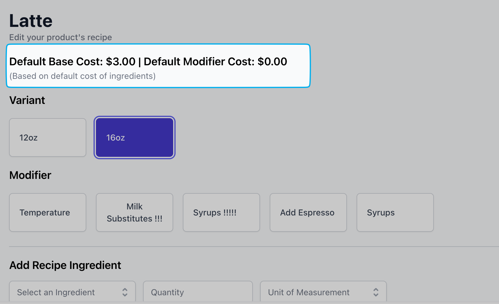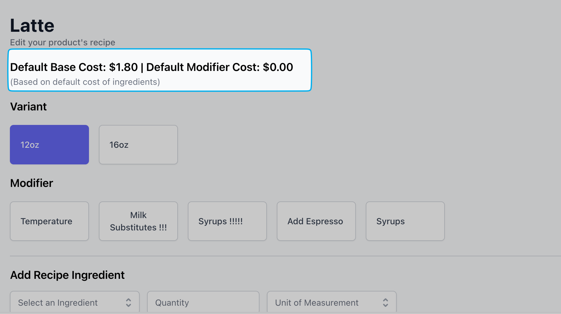 Each recipe has a default cost based on the modifiers selected.For example, a 12oz and 16 oz latte with no modifiers has a base cost of $1.80 and $3.00, respectively.