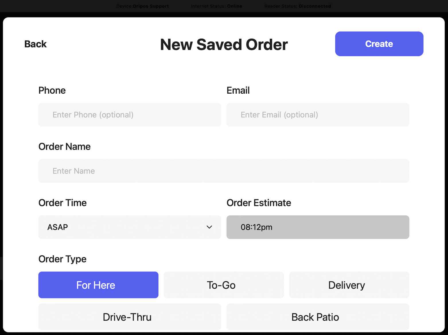 Press Create to save the order, then add products as normal