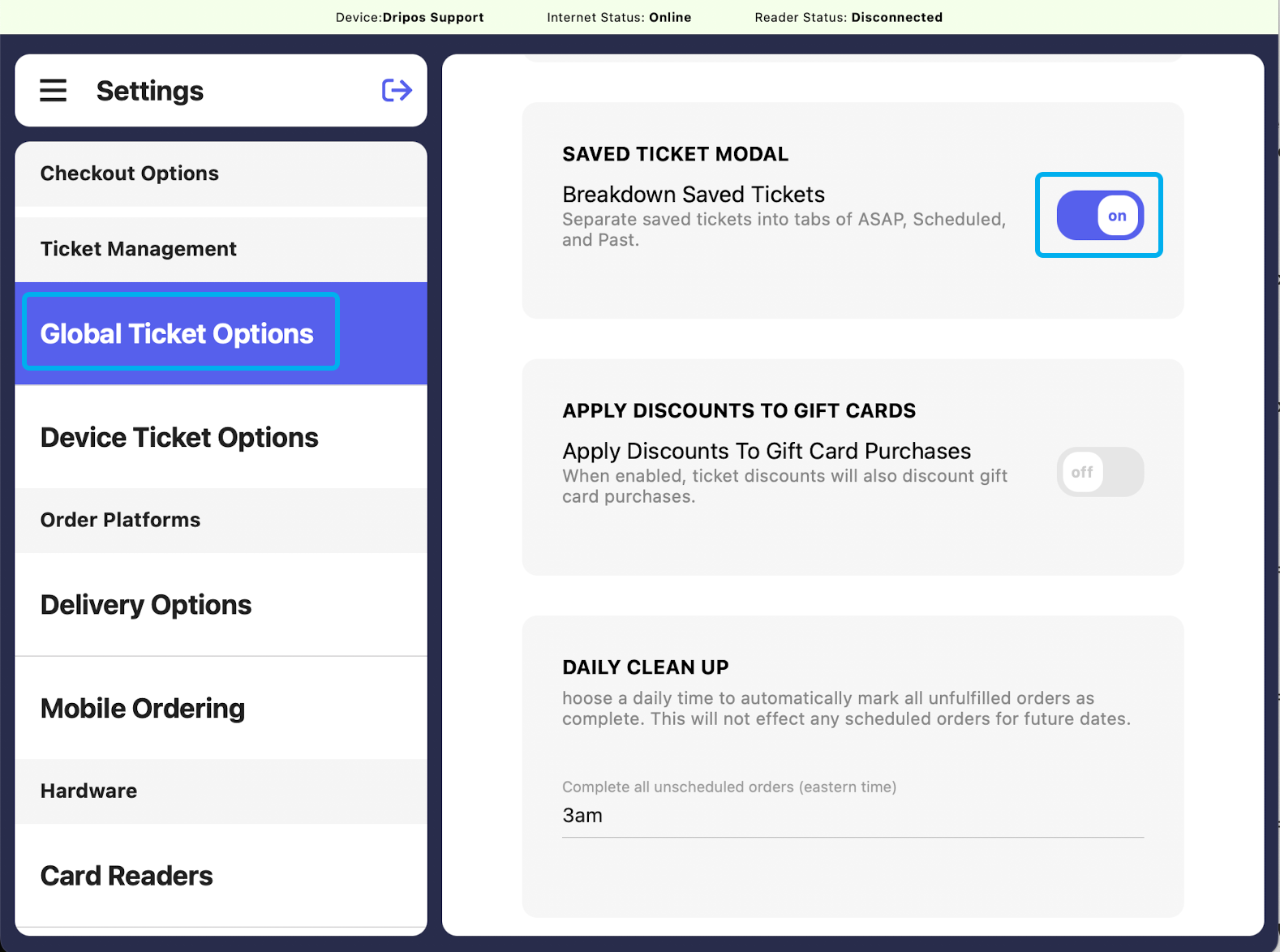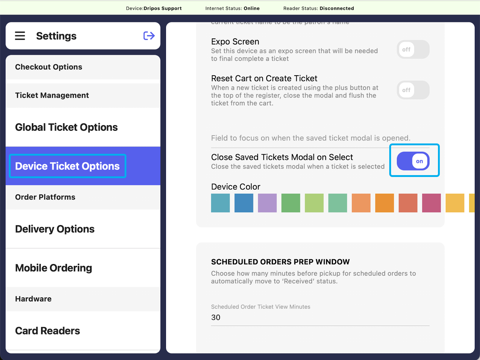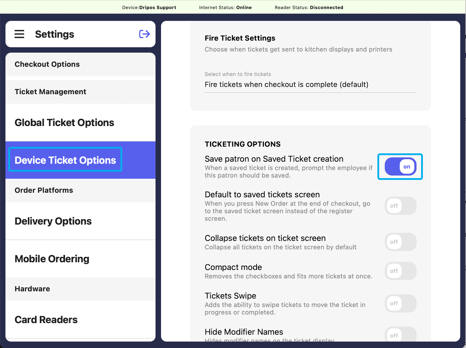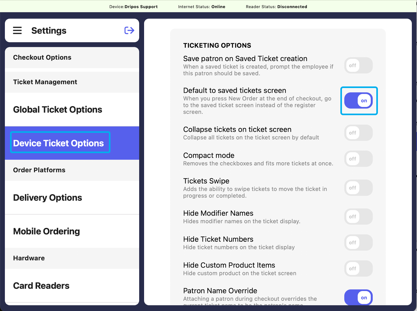 If Close Saved Tickets Model on Select is on, the saved tickets screen will close once a saved ticket is selected.To turn on: