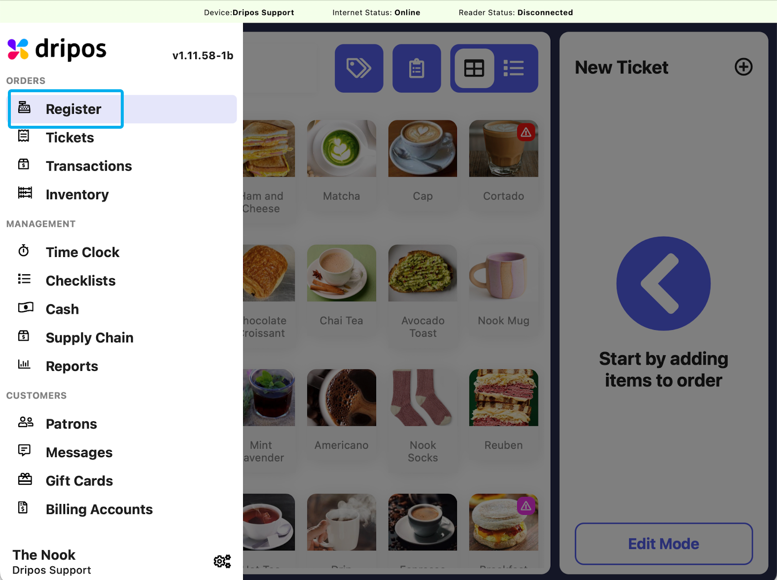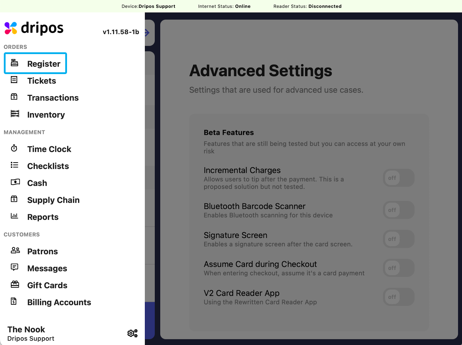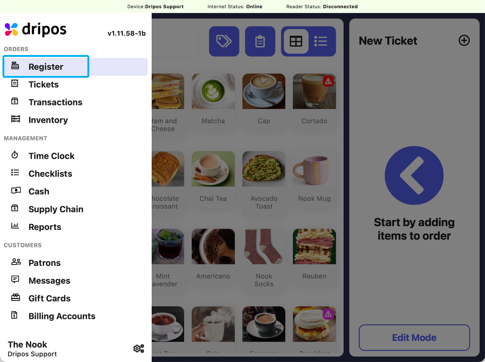 Navigate to the POS press the tribar in the upper left hand corner and select Register