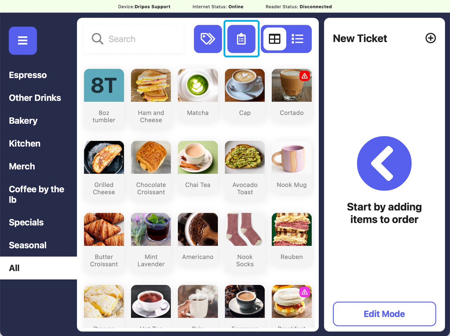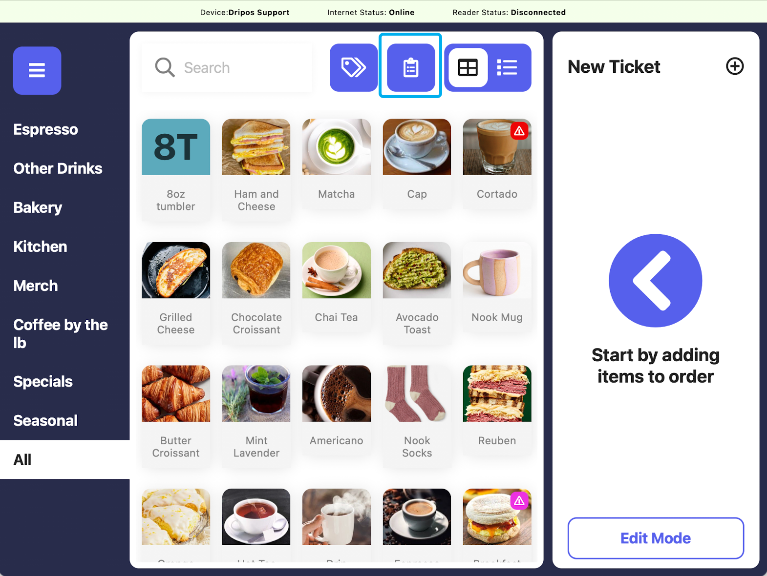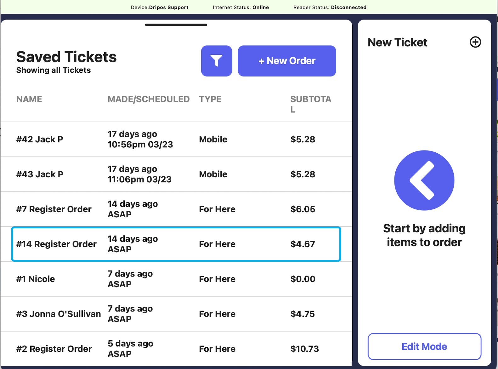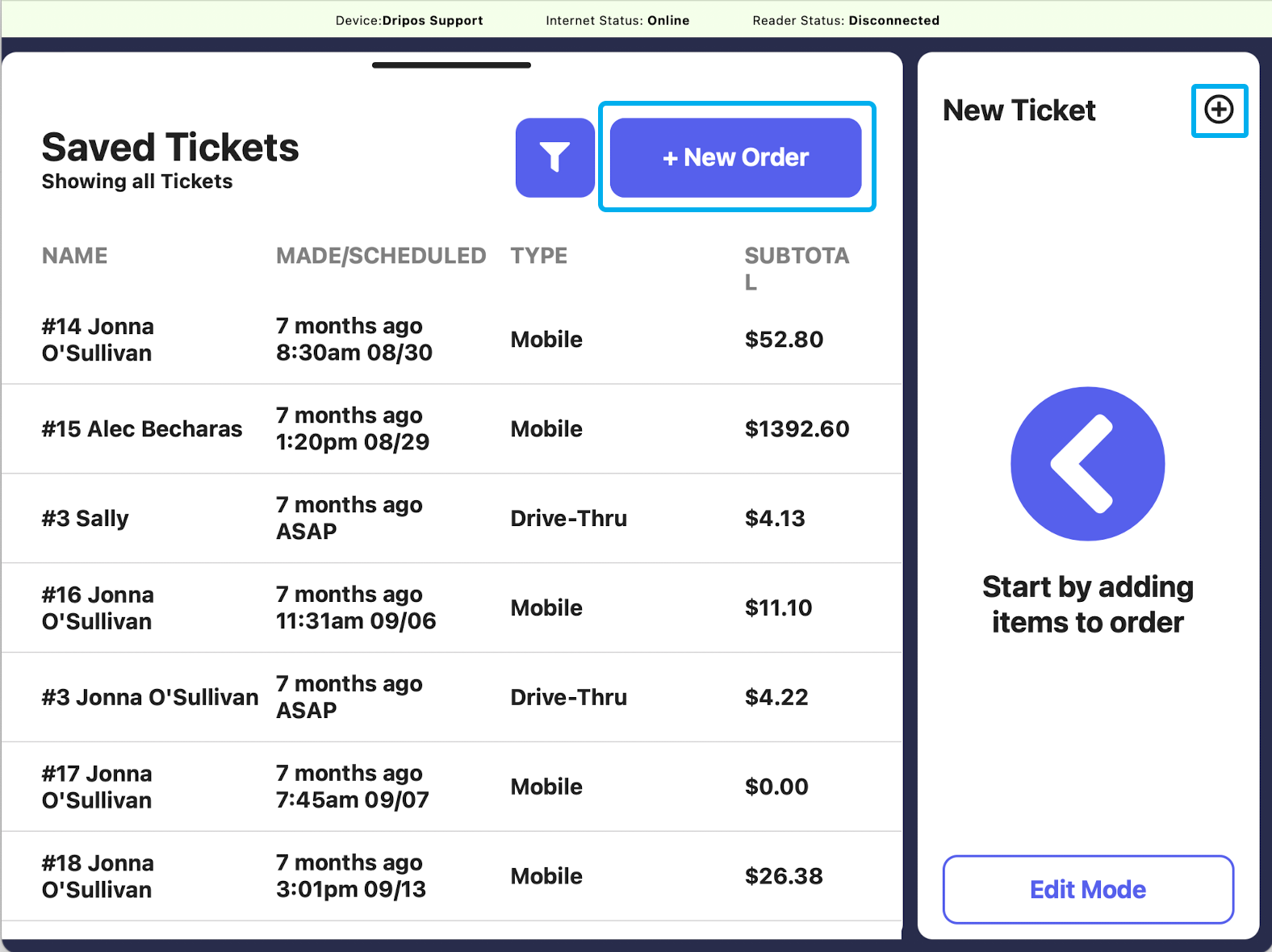 Press either the saved tickets page icon and then New Order, or press the New Ticket + button on the right hand side
