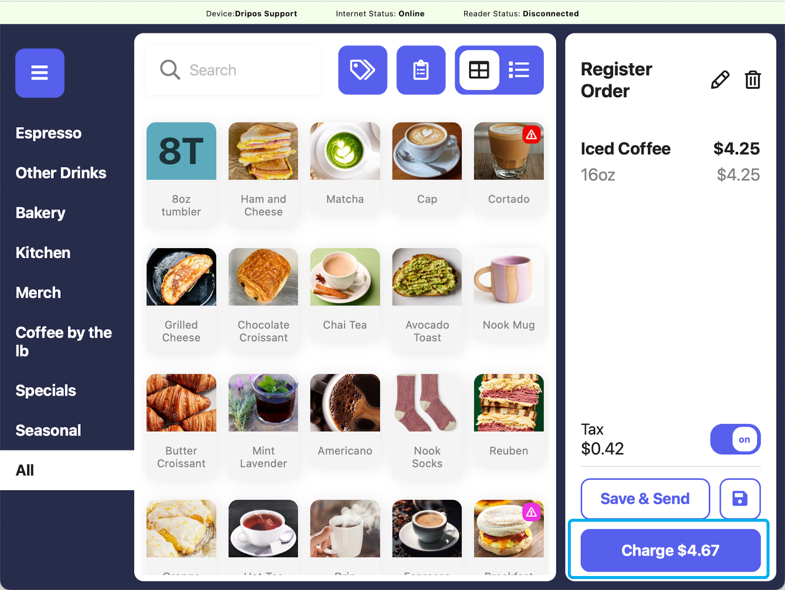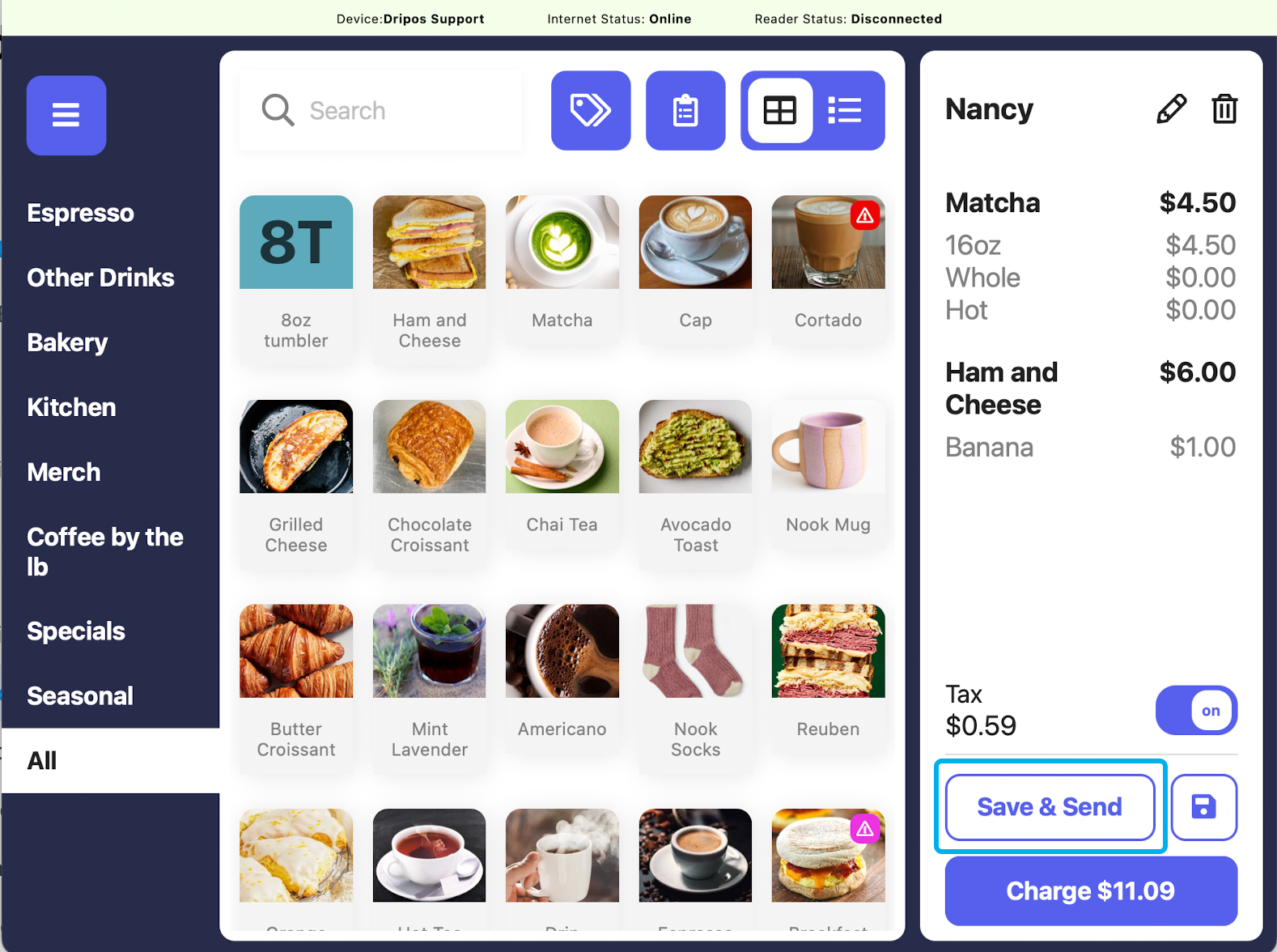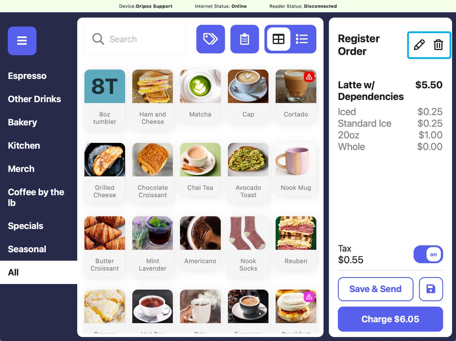 On the right hand side, press the pencil icon to edit the ticket information.Press the trash icon to delete the order.Add more products to the saved ticket by adding to cart as usual and then pressing Save and Send or Save.