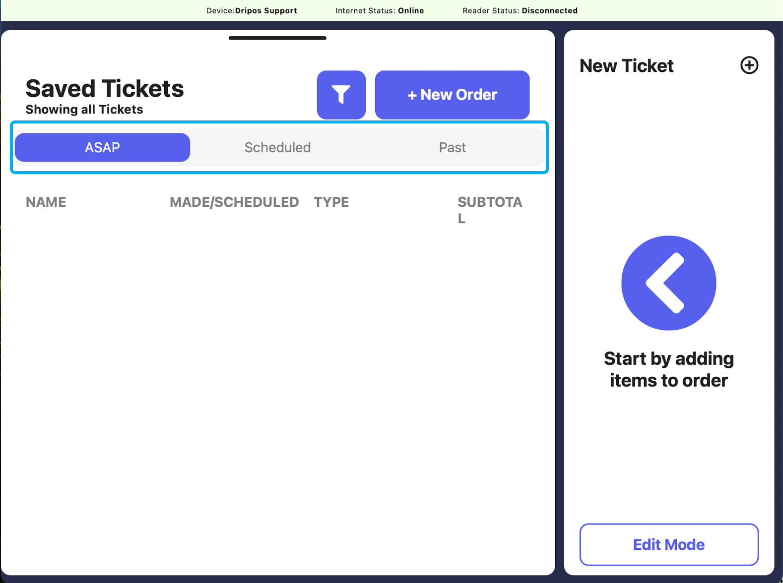 If Breakdown Saved Tickets is on, the saved tickets screen will be sorted into ASAP, Scheduled, and Past: