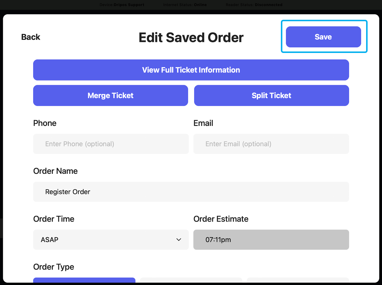 There are multiple setting that change how saved tickets can be used at the POS:Breakdown Saved Tickets