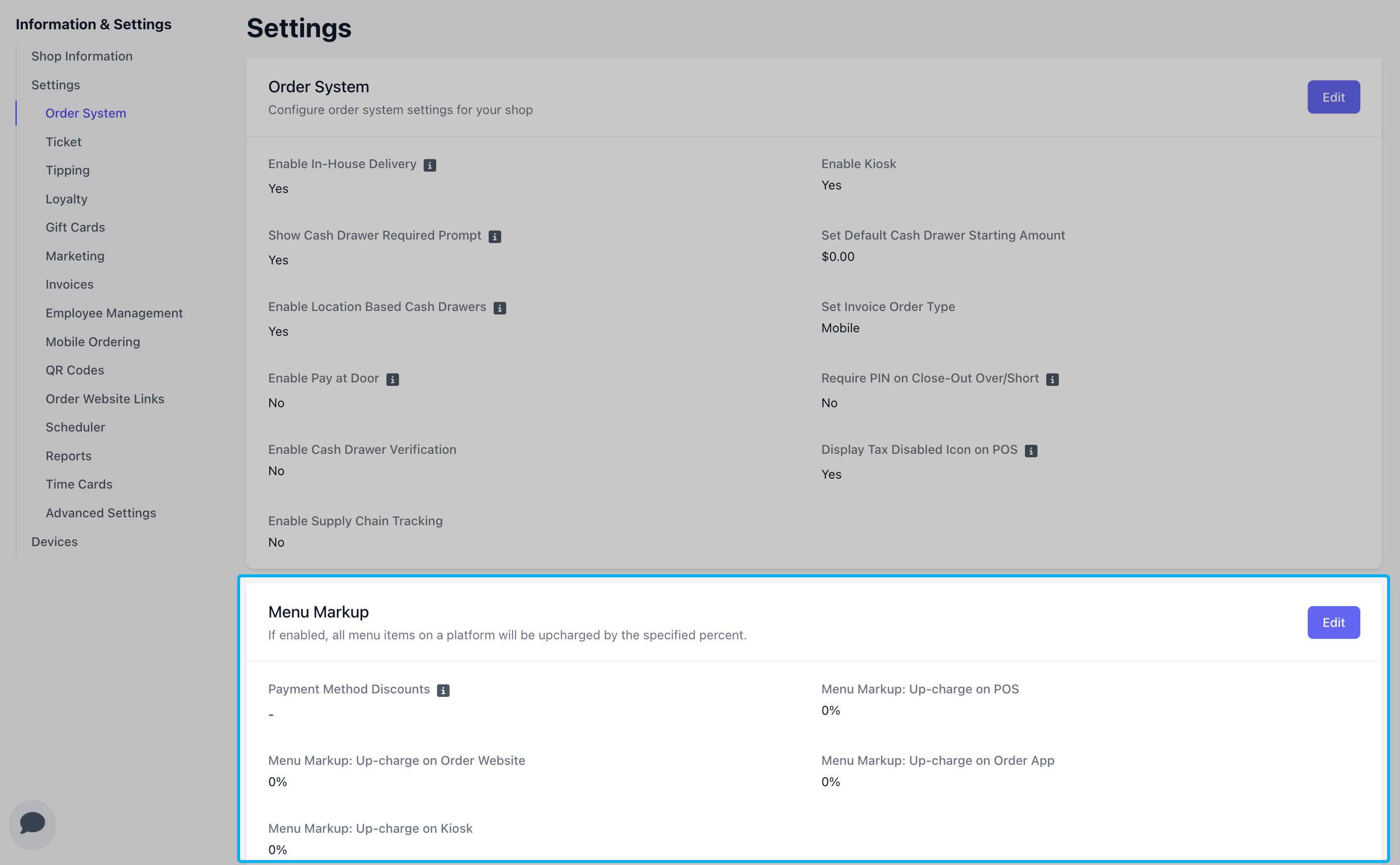Menu Markup is a location-based setting and must be enabled individually for each location.