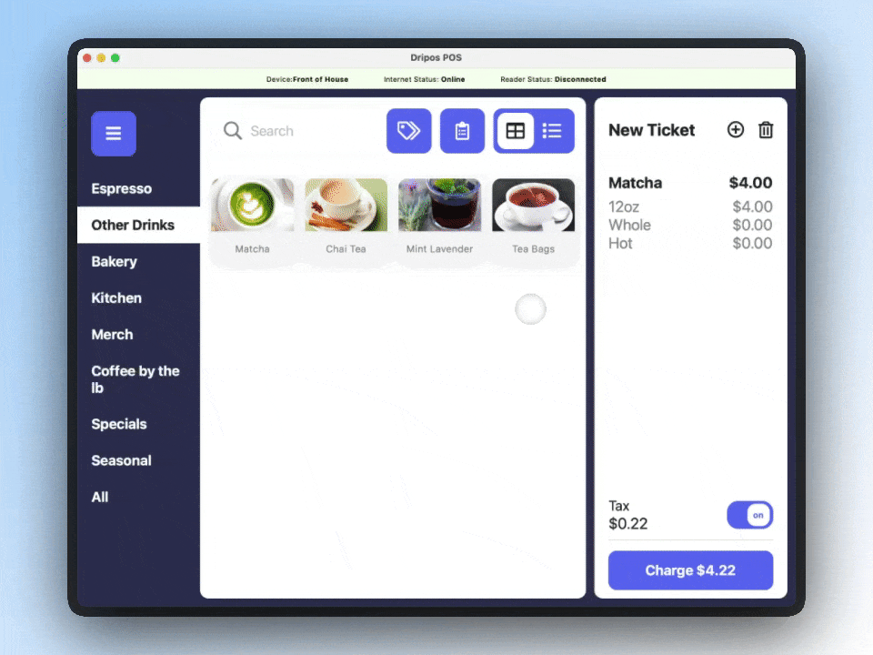Four ticket types will automatically be set up in your Dripos system: