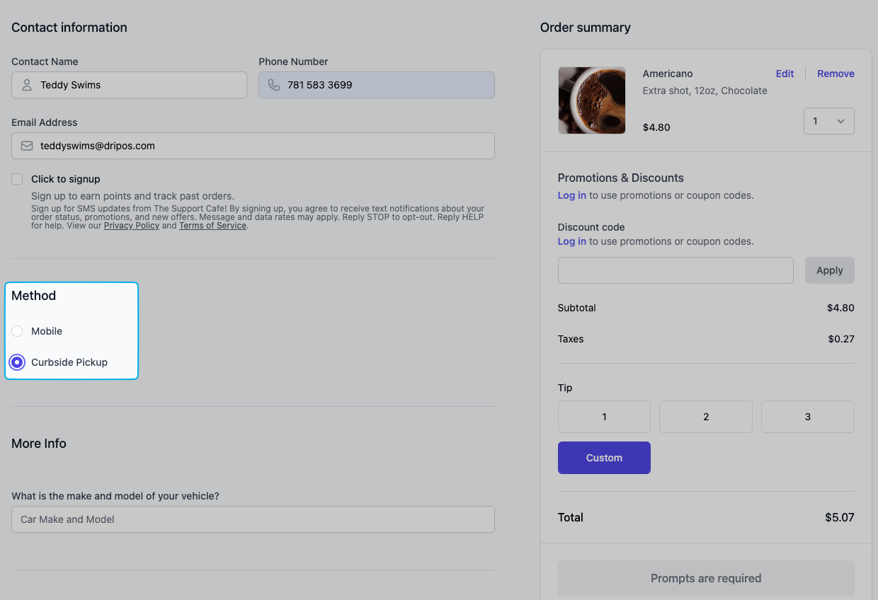Patron can place an order via the Order App and Order Website and their order will be delivered by a DoorDash driver *Please reach out to Dripos Support to enable this ticket type