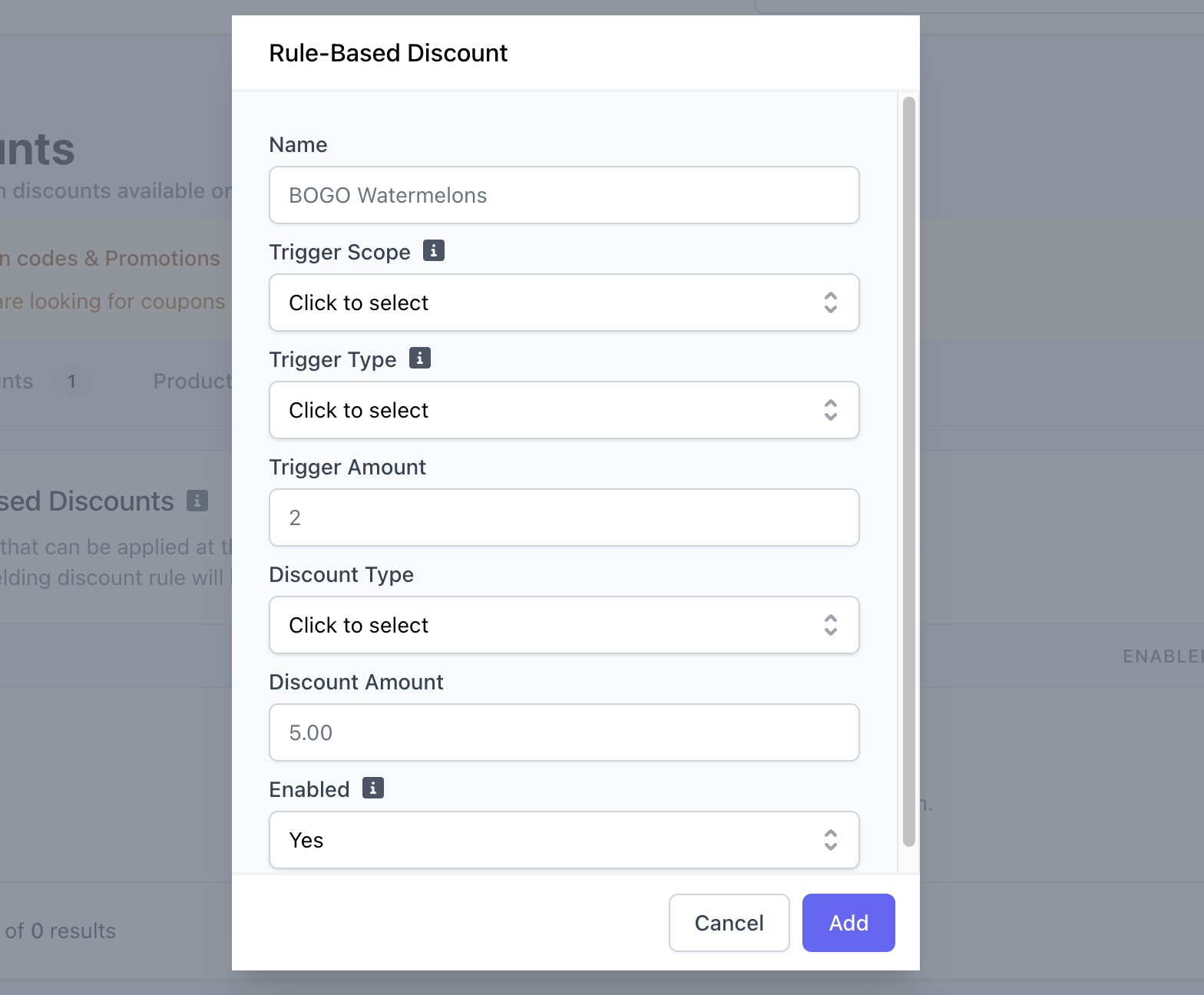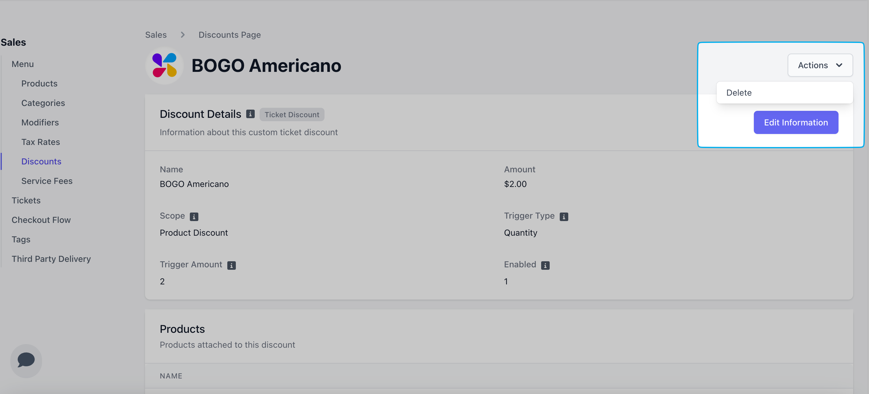 When Enabled = Yes, a rule-based discount will apply automatically to cart when triggered upon checkout on all order platforms: Point of Sale Order Website Order App Dripos GOWhen Enabled = No, a rule-based discount is considered inactive and will not apply to cart on any of the three order platforms.To edit or delete a rule-based discount, either click Edit Information or Actions > Delete, respectively.