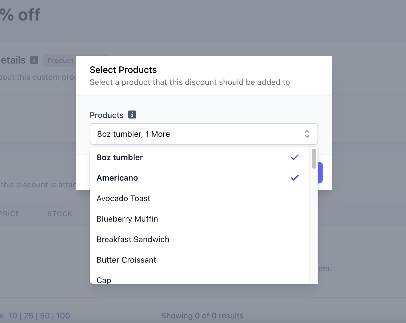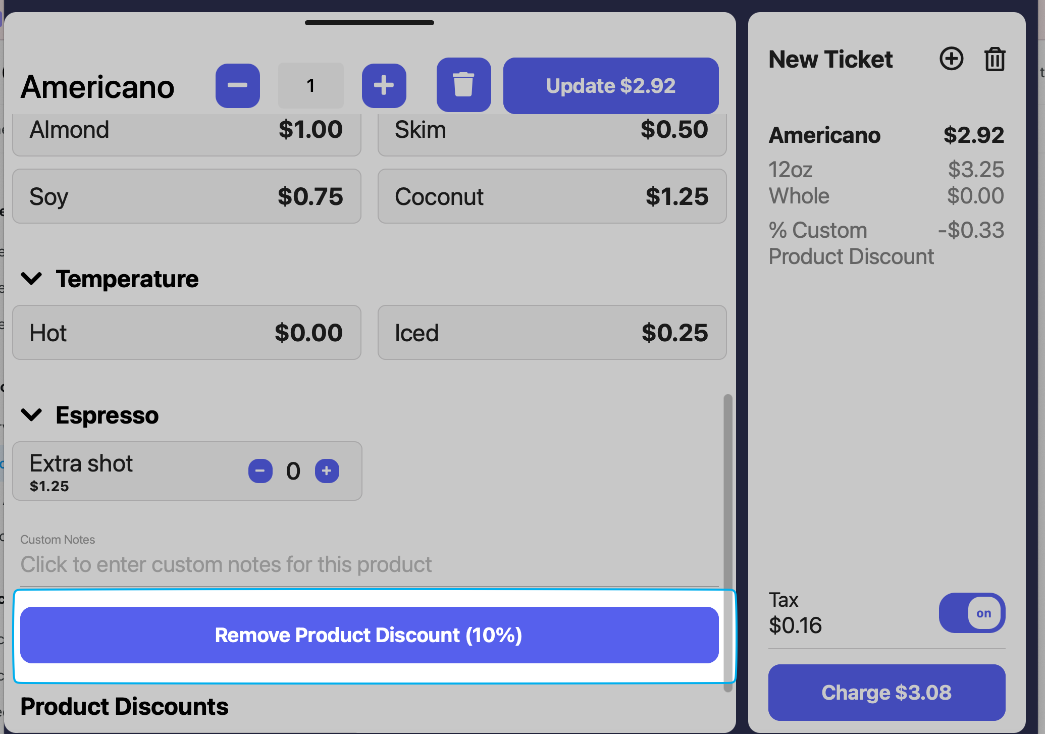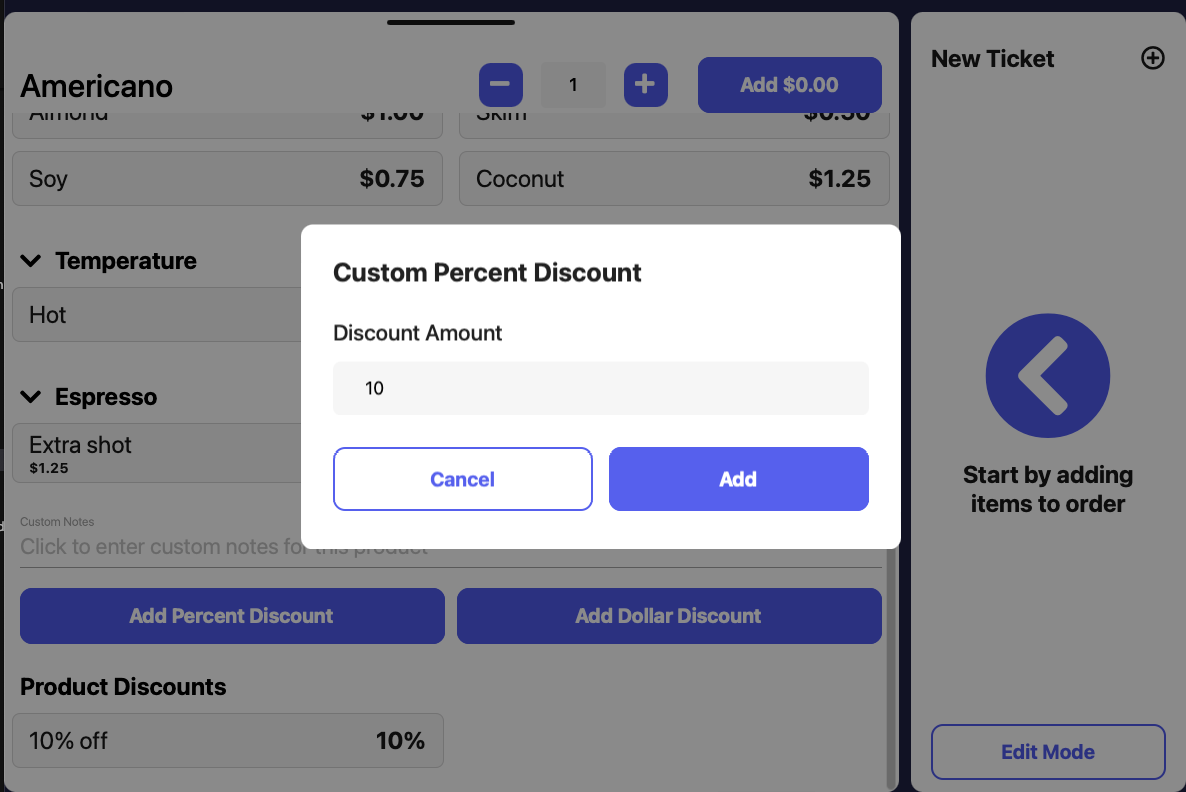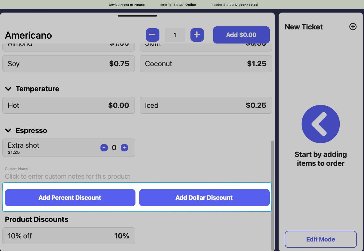 Any applicable product modifiers will be listed for use. Tap to add the discount and add the product to cart.