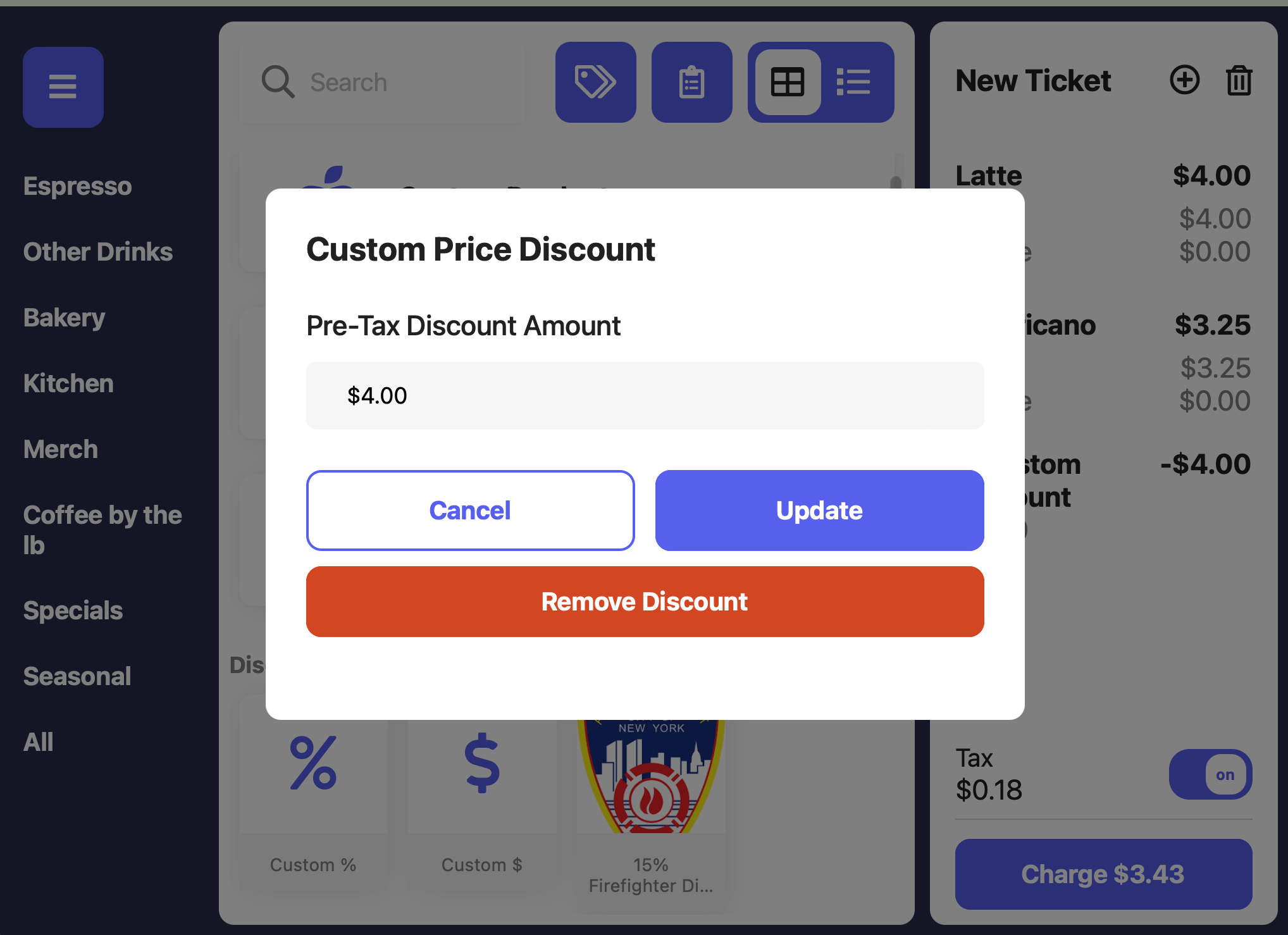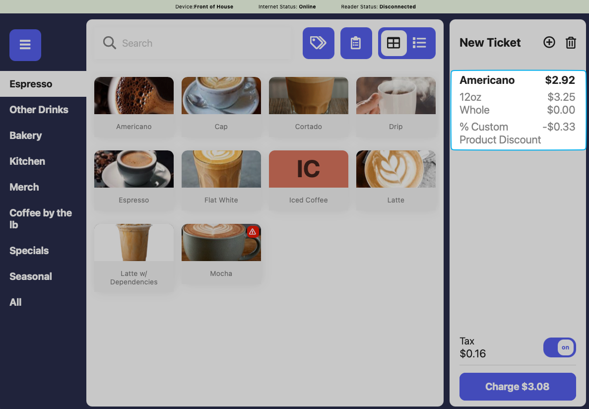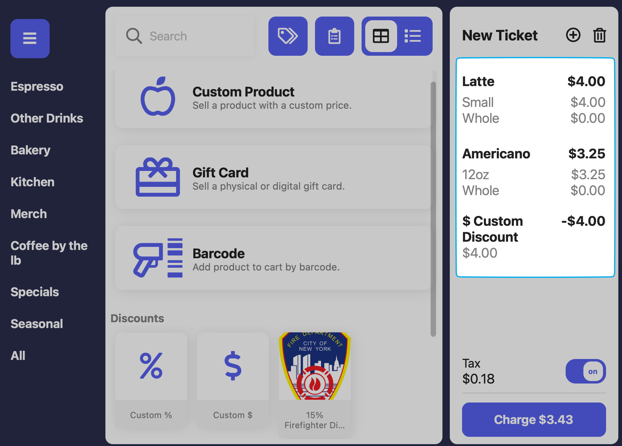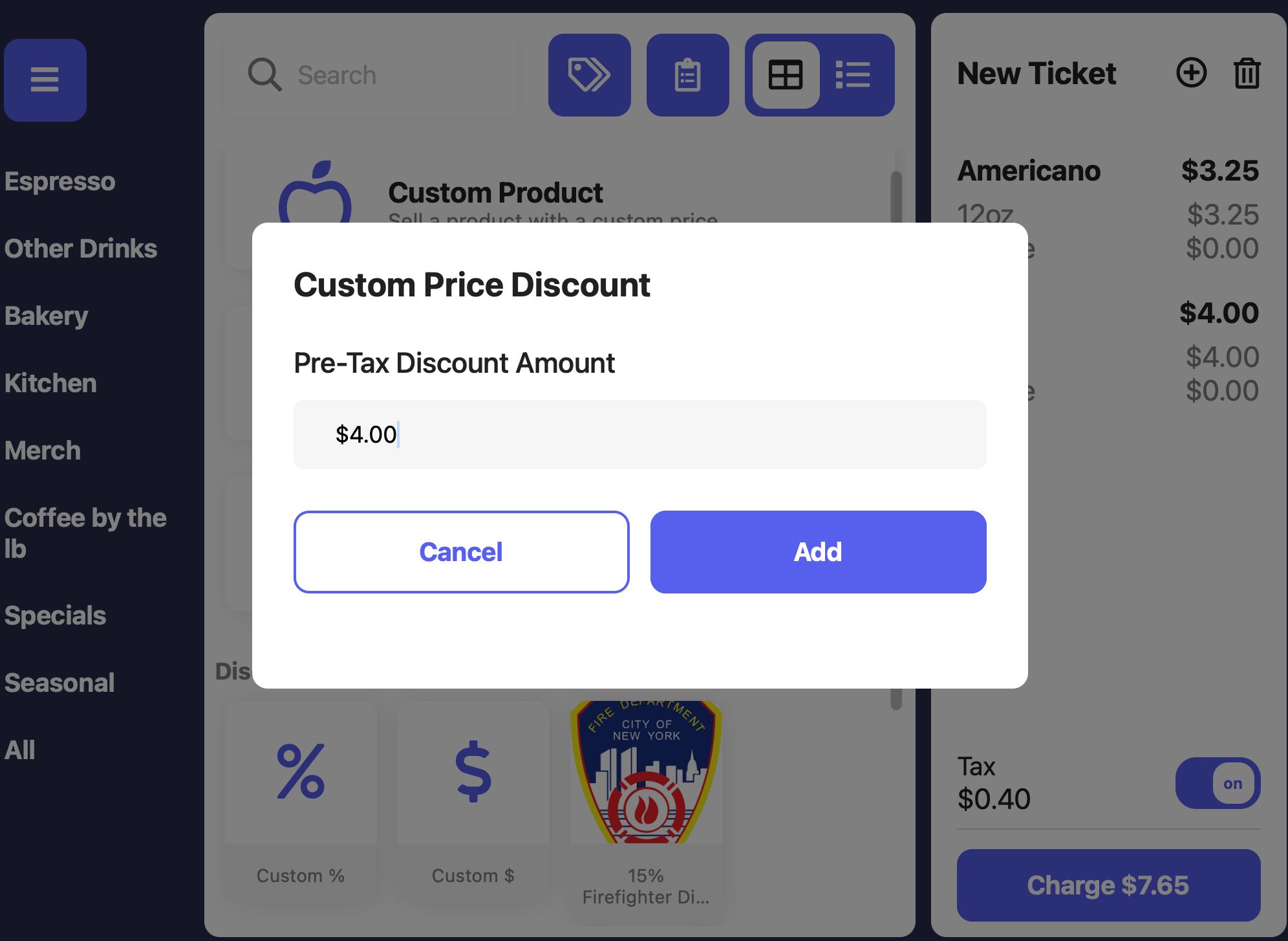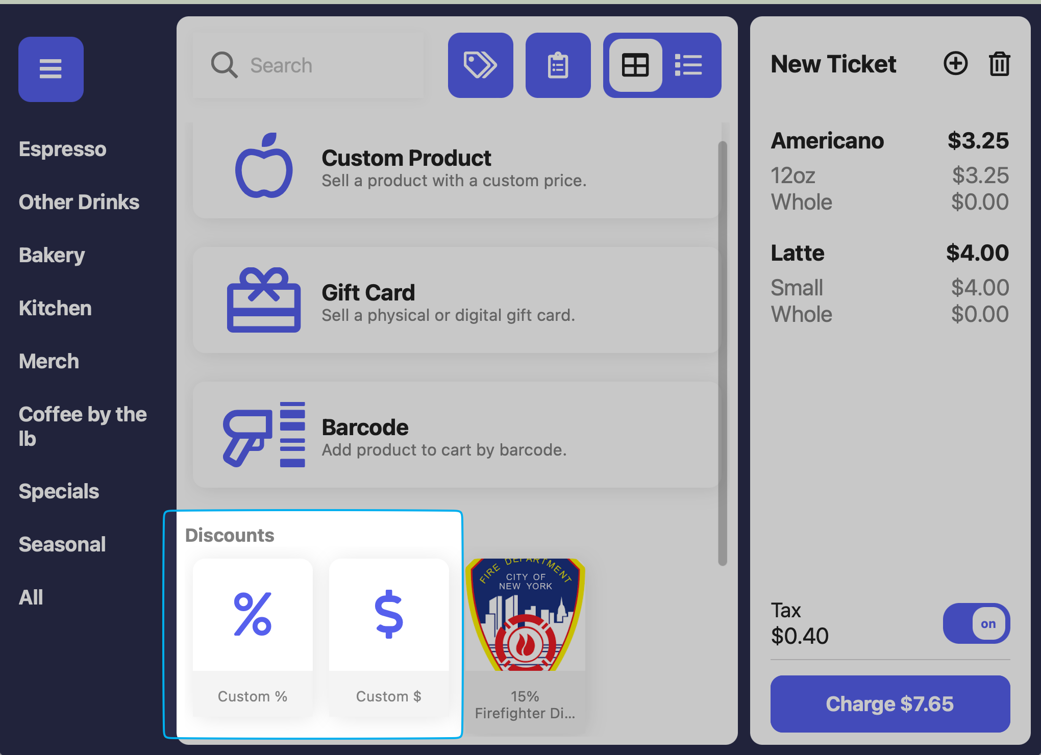 Custom Discounts can be applied at the product level and the ticket level from the Point of SaleCreate Custom Product Discount