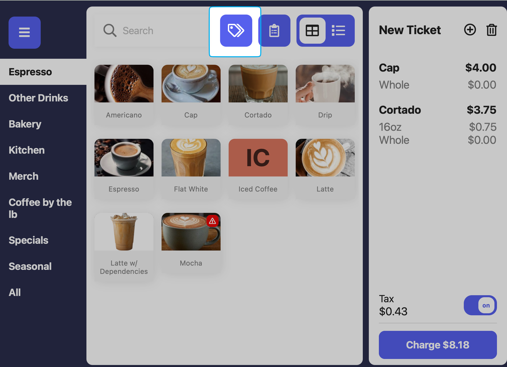 Before checkout, press the tag icon at the top of the register to navigate to the Main Register Page