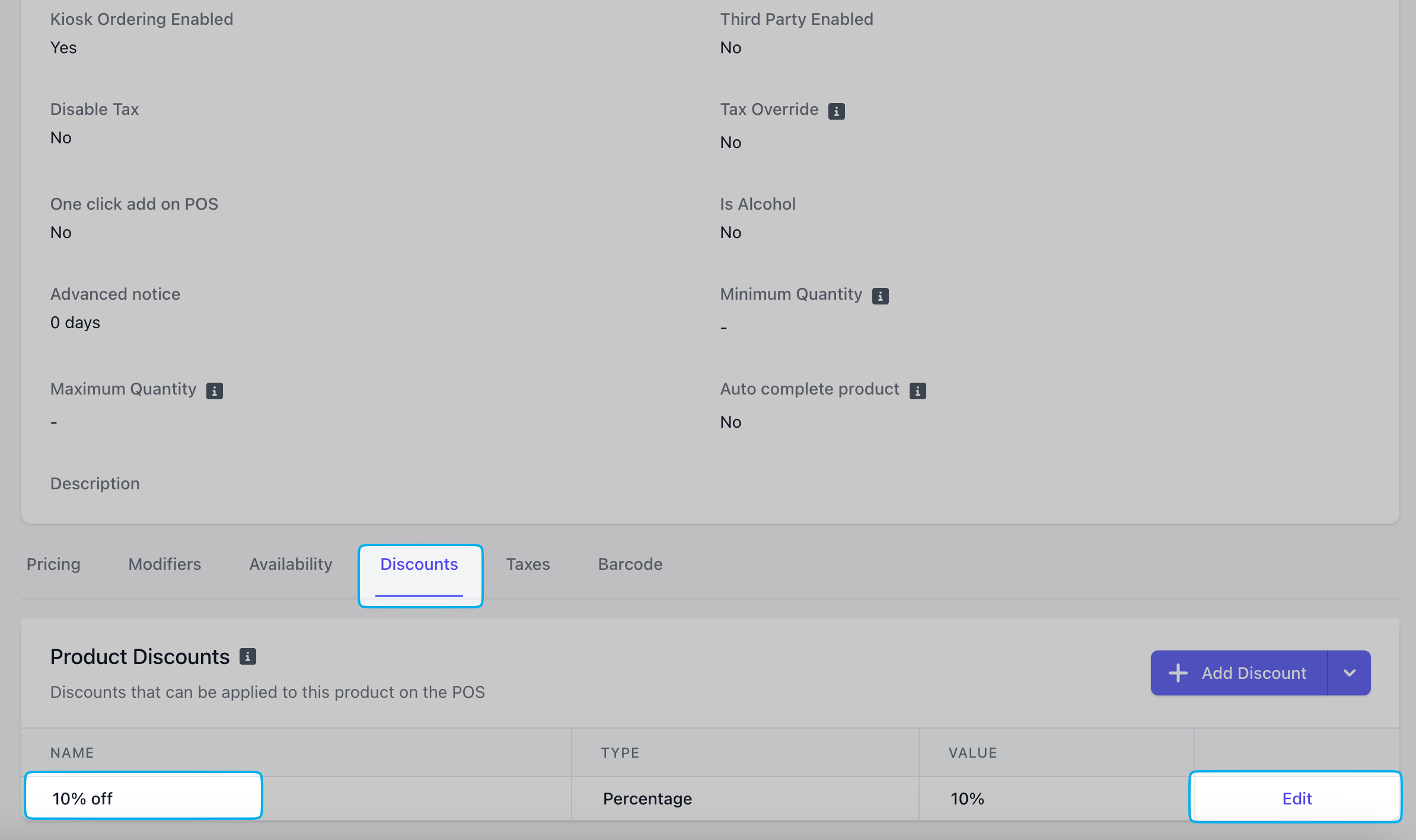 Scroll to the bottom of the product’s page > click Discounts > click Edit