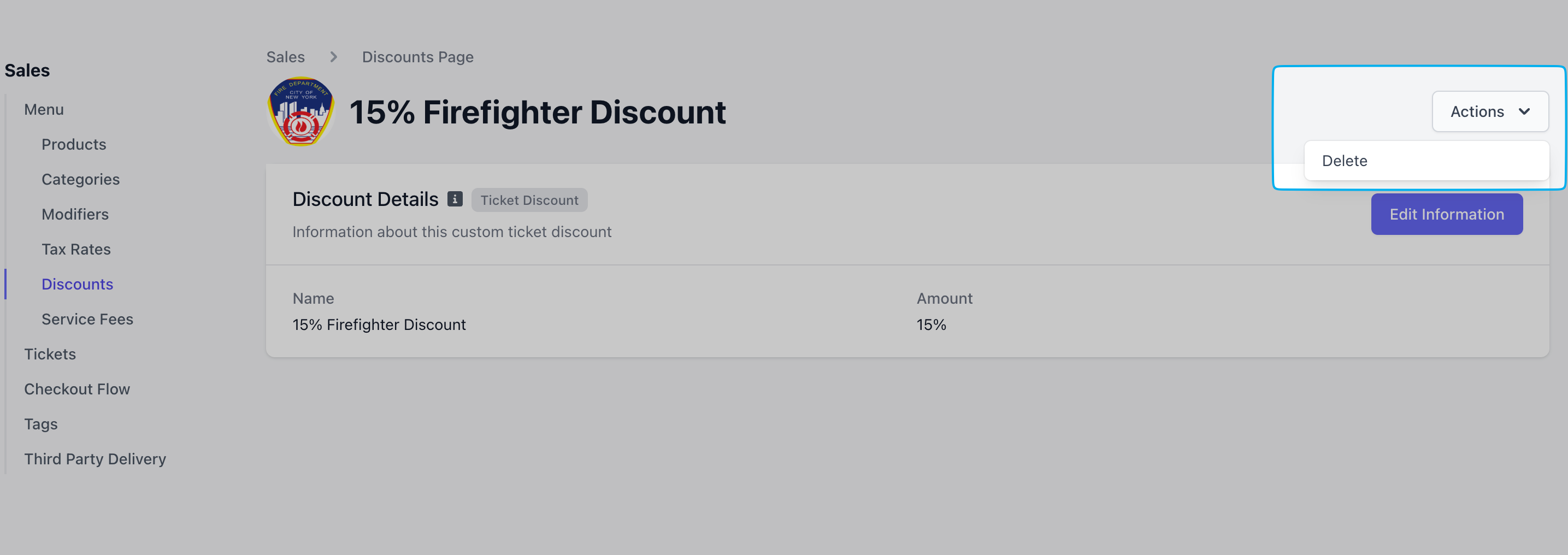 Edit this ticket discount’s name, type, and amount at any time by clicking Edit Information.