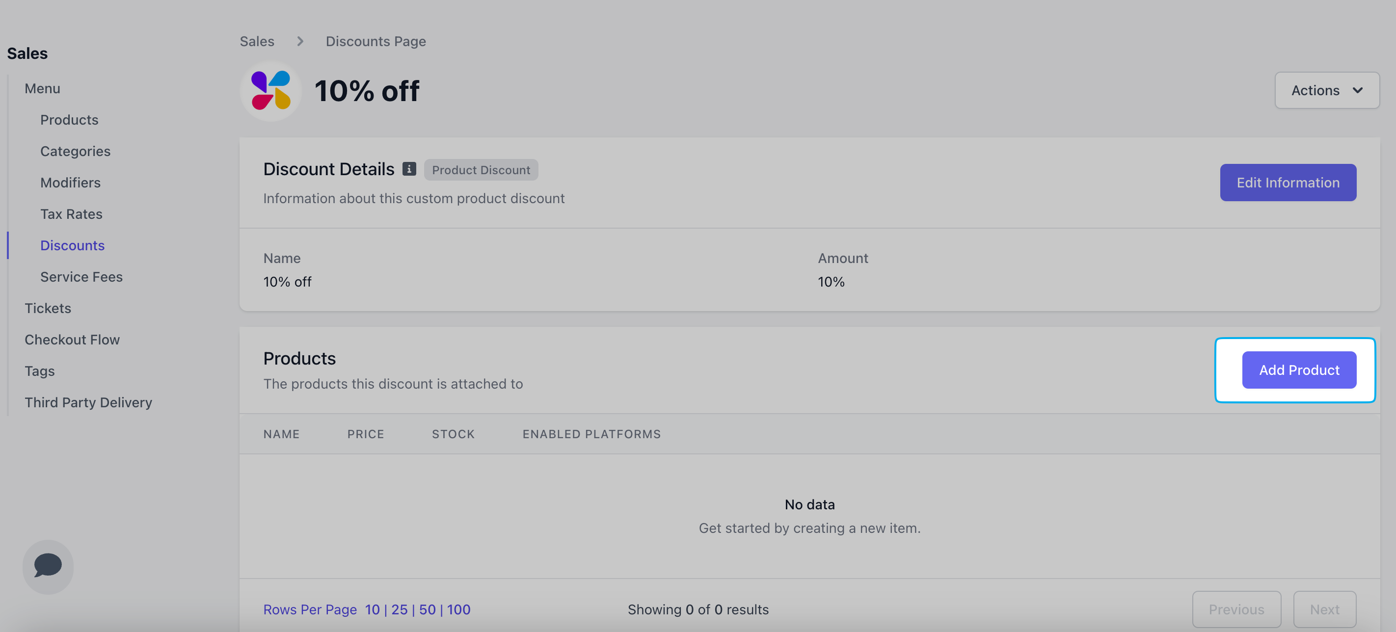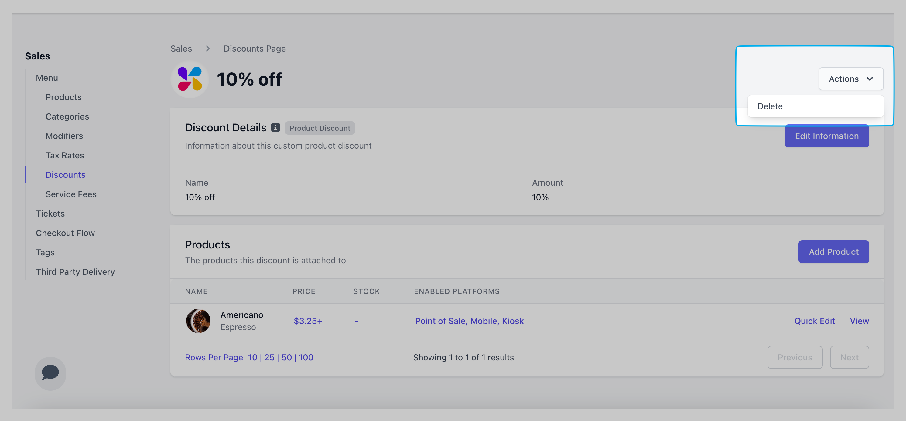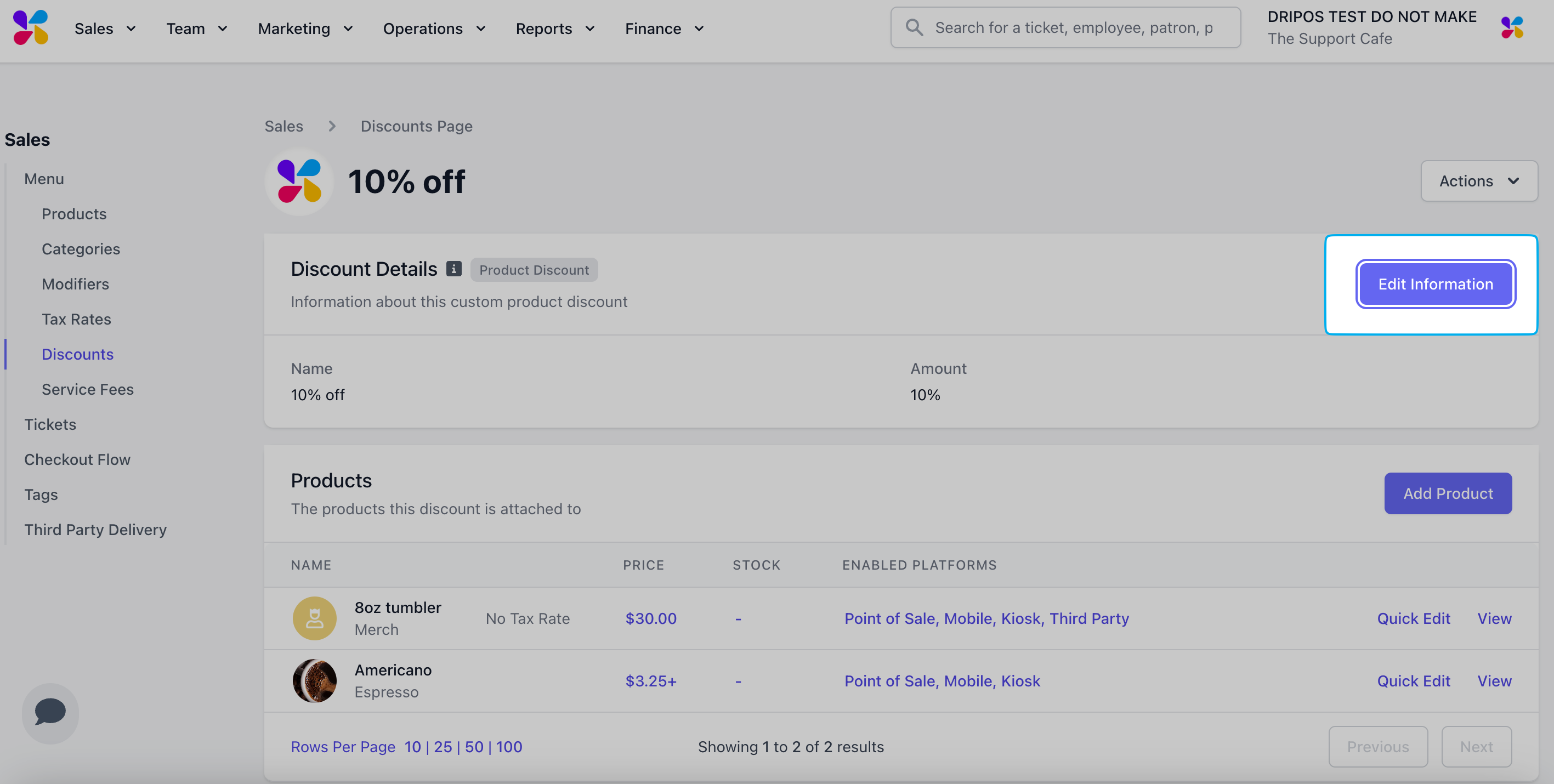 Edit this product discount’s name, type, and amount at any time by clicking Edit Information.