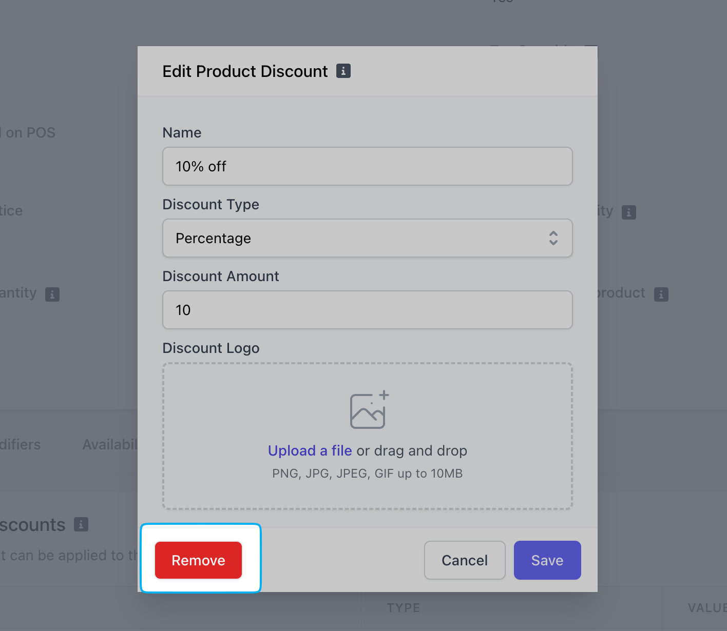 Click Remove to detach this discount from the product