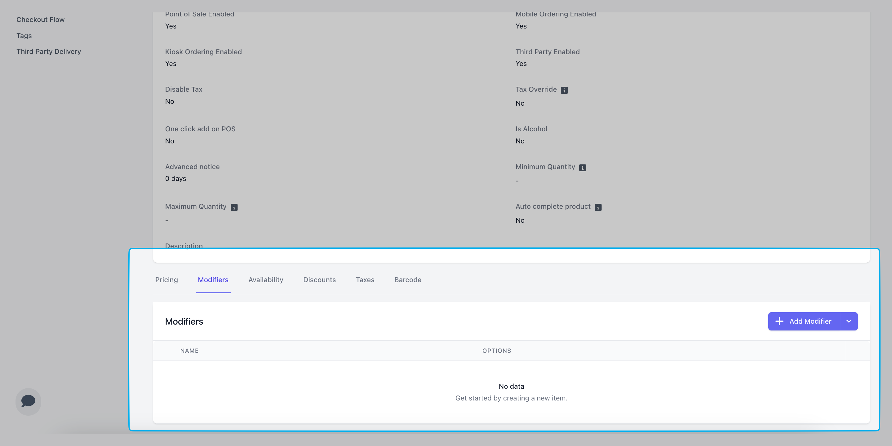 Name: i.e., raspberry syrupPrice: Cost of modifier to add on to base price of productEnabled: If Yes, this modifier option will be available for ordering