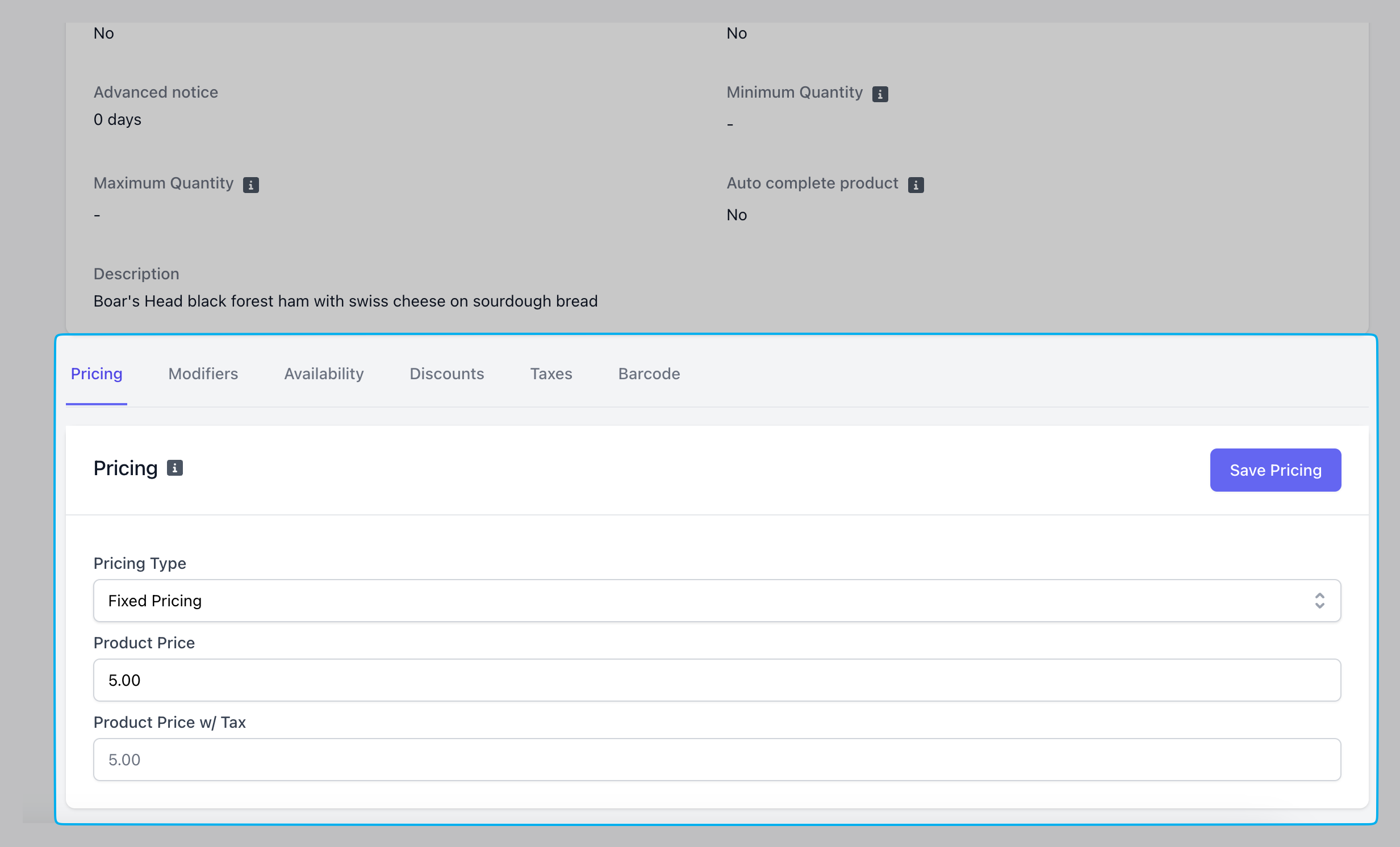 - Maximum Quantity: Optionally input a maximum quantity of this product that can be purchased in a mobile order. This does not impact POS orders.