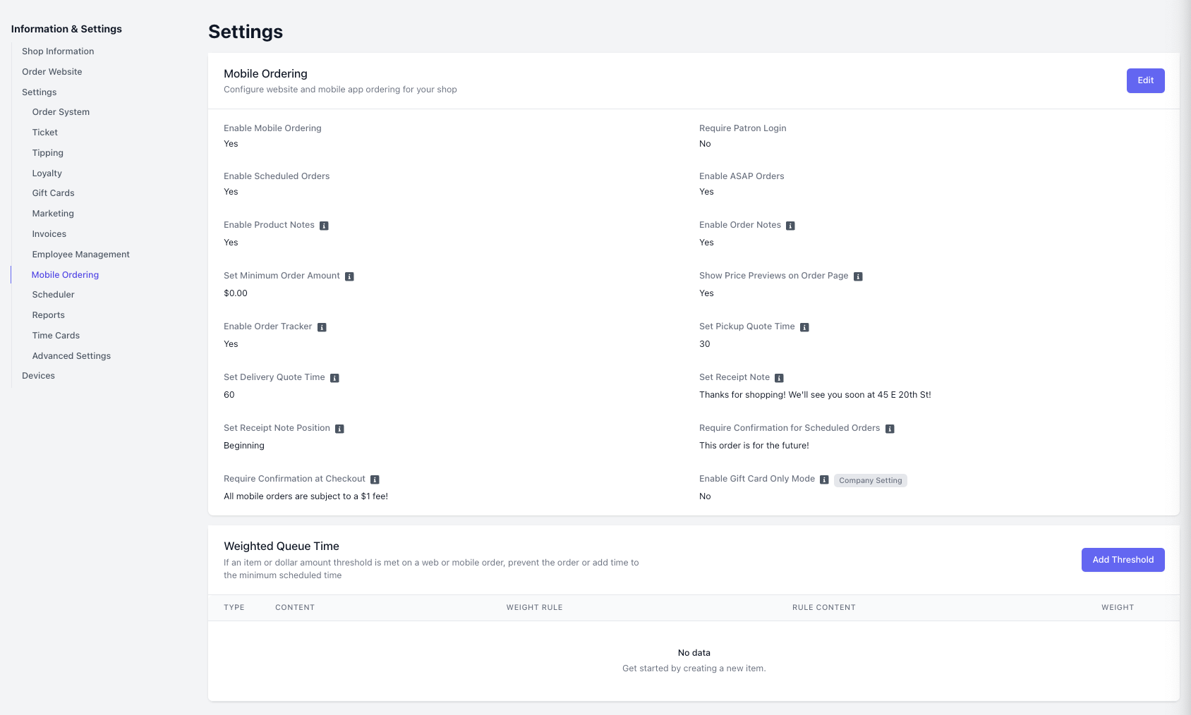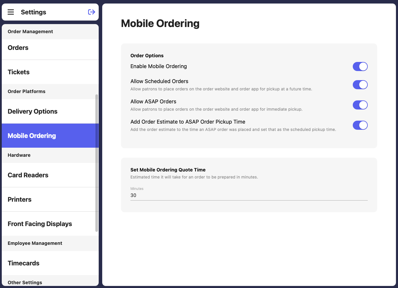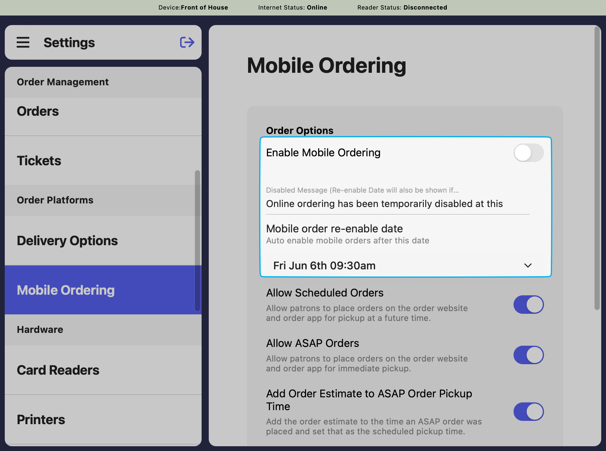 If disabled, Mobile Ordering is immediately disabled from the mobile order website and mobile order app.