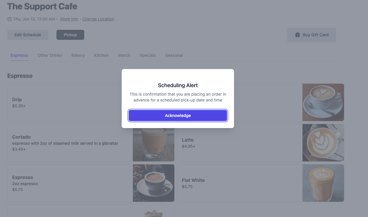 If enabled, displays a pop-up when selecting scheduled requiring customer to Acknowledge before scheduling an order one or more days in advance.
