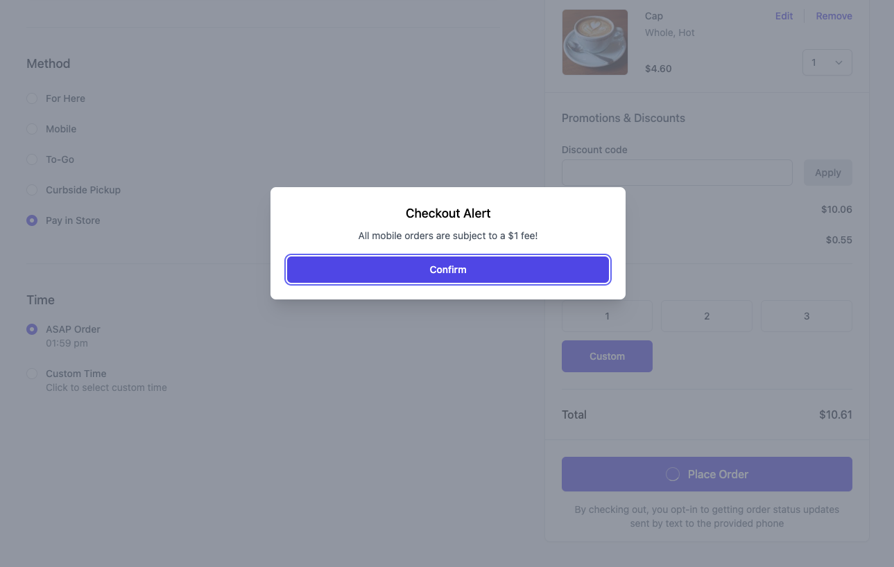 If enabled, displays a pop-up at Checkout to Confirm before completing an order.