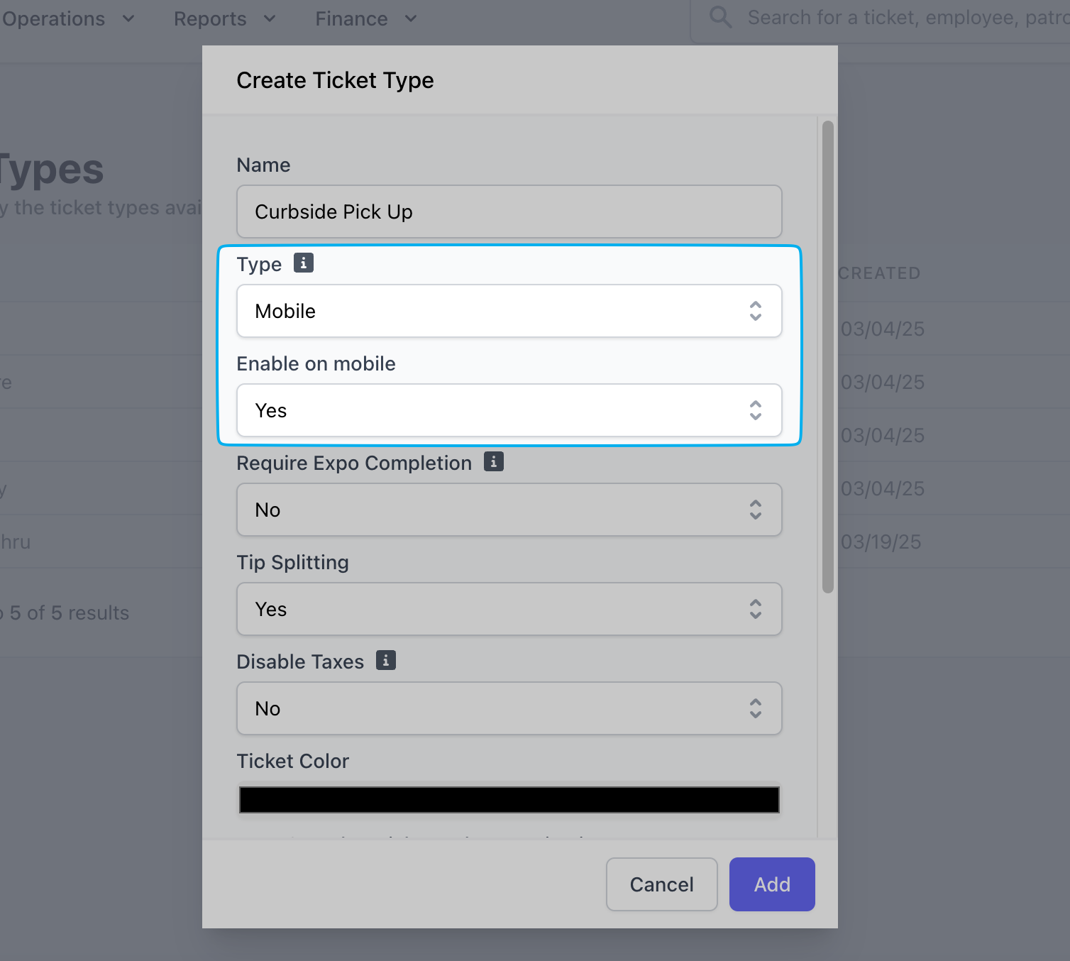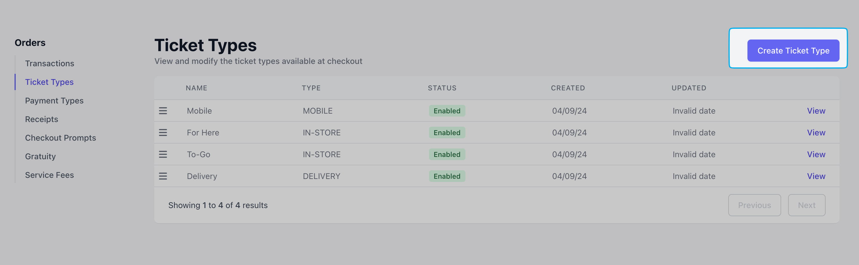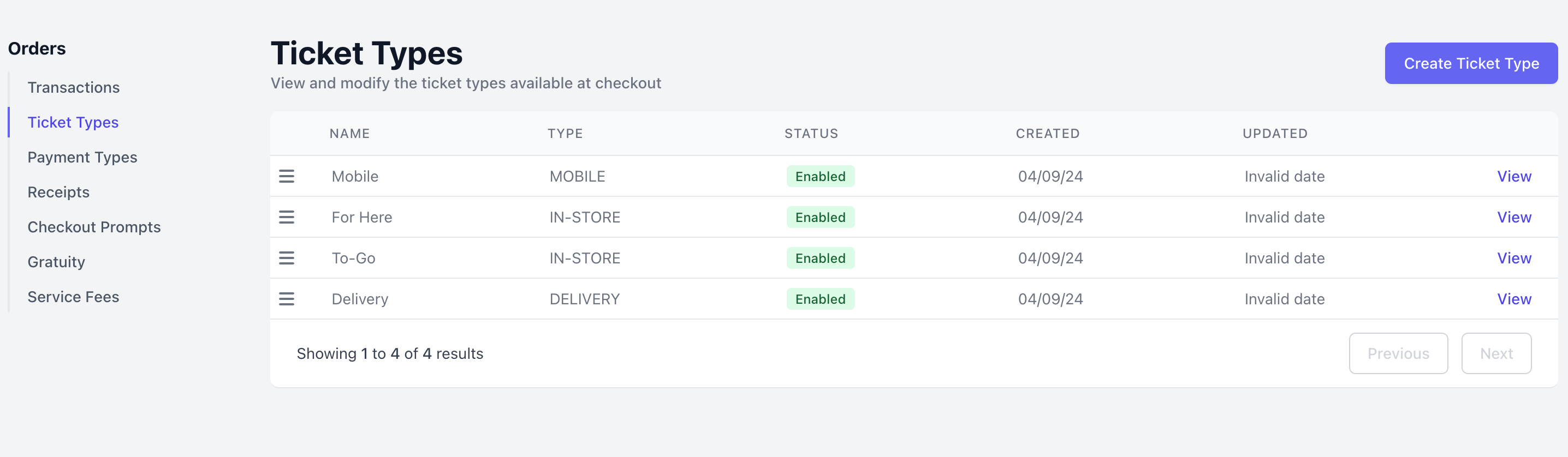 Create new ticket types specifically for mobile checkout. Existing ticket types, such as For Here or To-Go, can also be used at checkout. To create or adjust mobile ticket types, on the Dashboard click Orders > Ticket Types