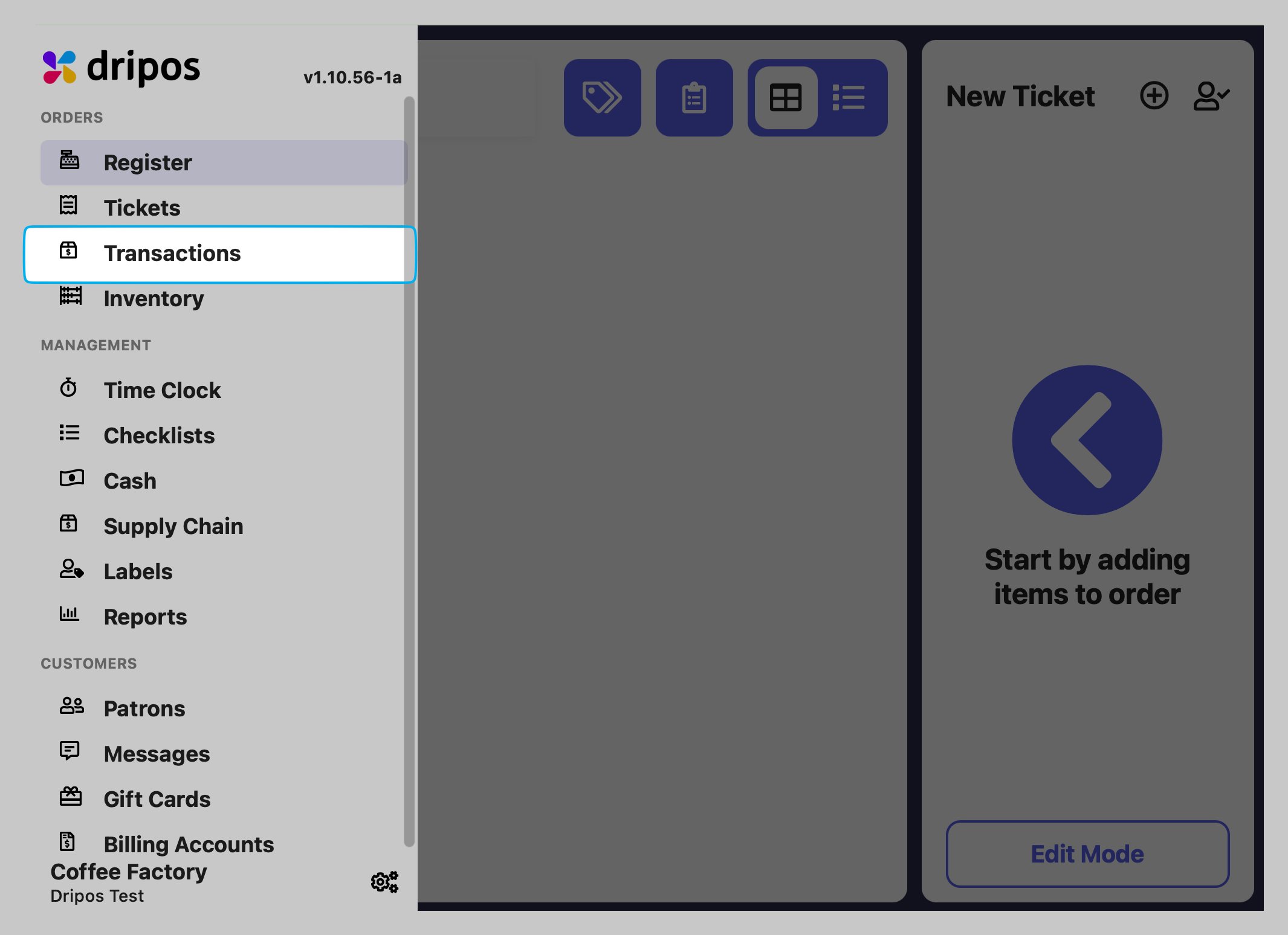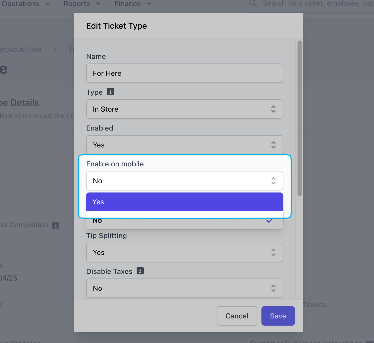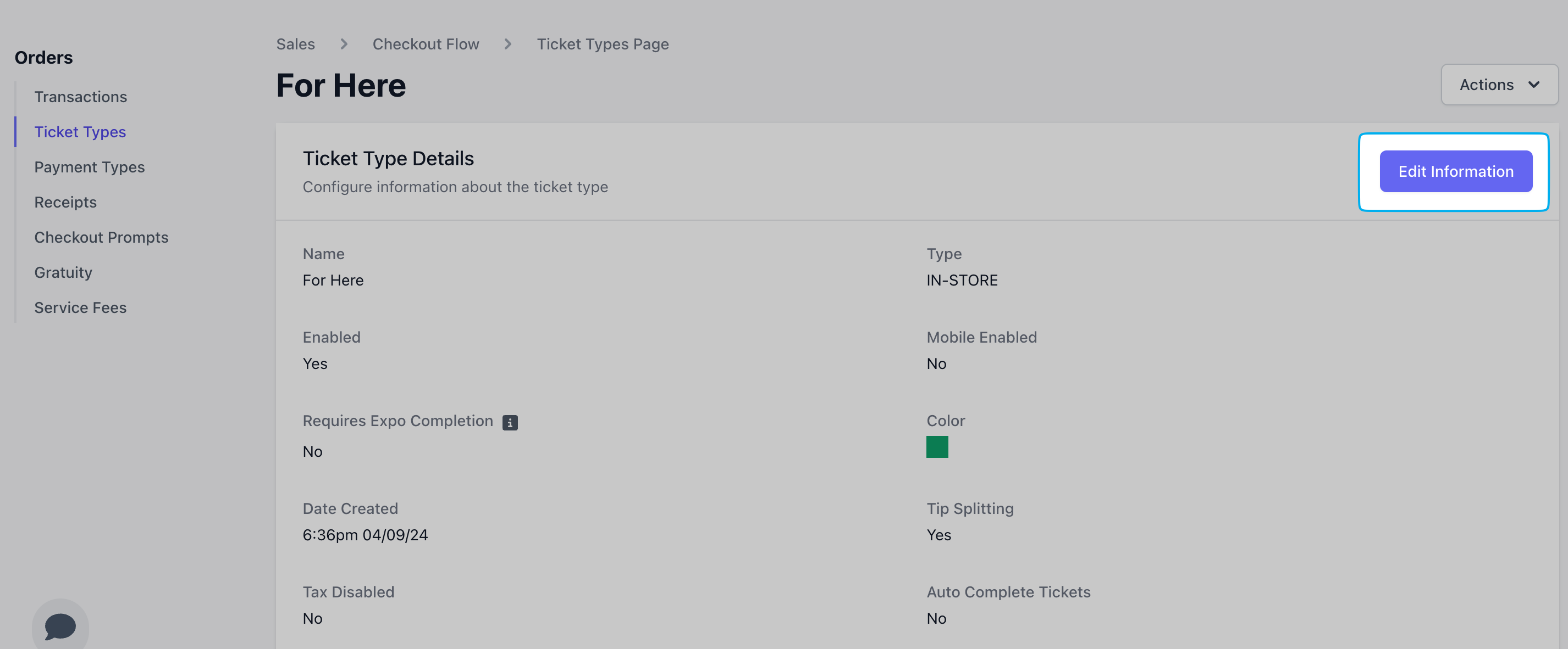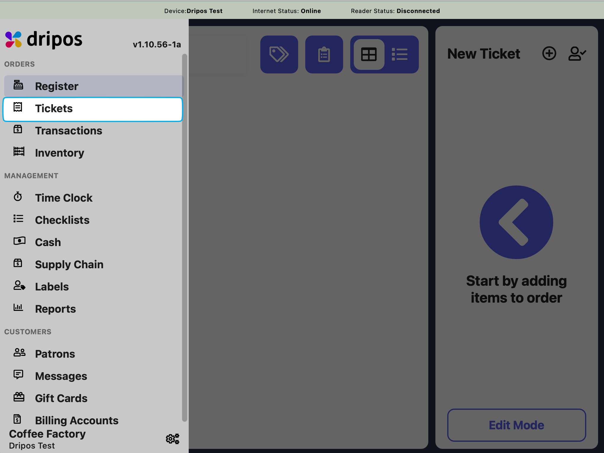Create new ticket types specifically for mobile checkout. Existing ticket types, such as For Here or To-Go, can also be used at checkout. To create or adjust mobile ticket types, on the Dashboard click Orders > Ticket Types
