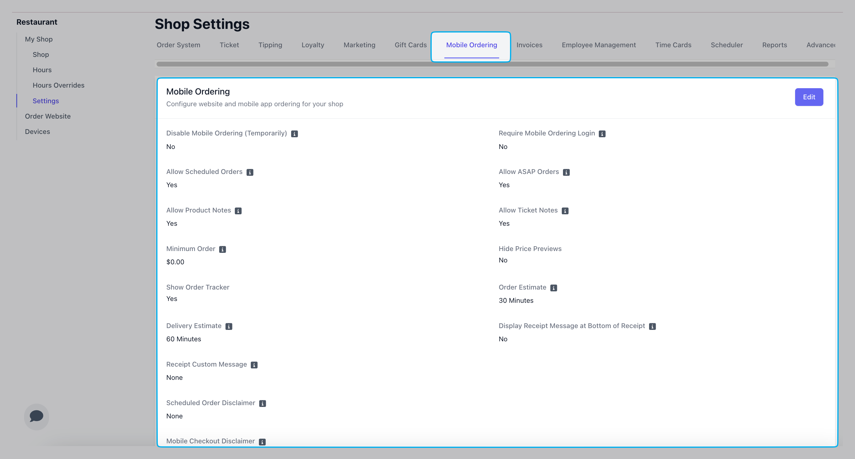 Use Mobile Ordering settings to configure the best workflow for your shop.Navigate to the Dashboard > click on the settings icon in the top right corner > Settings > Mobile Ordering