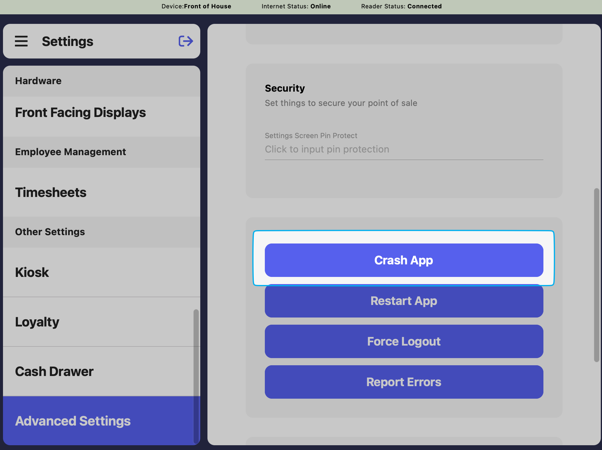 - On the Point of Sale press the tribar in the upper left screen corner > press the Settings button