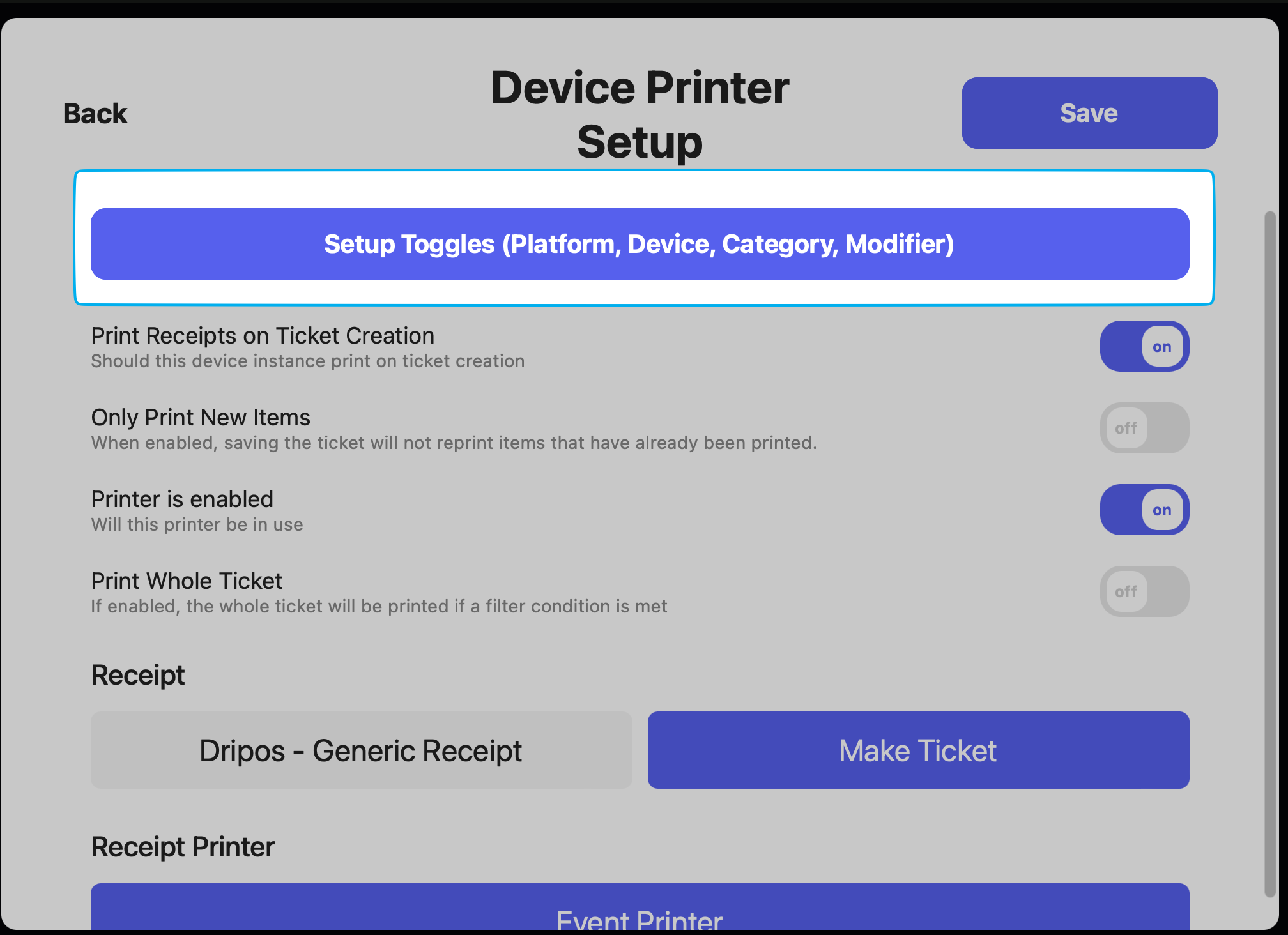 Include or exclude your DriposGO tickets from printing at your Point of Sale.