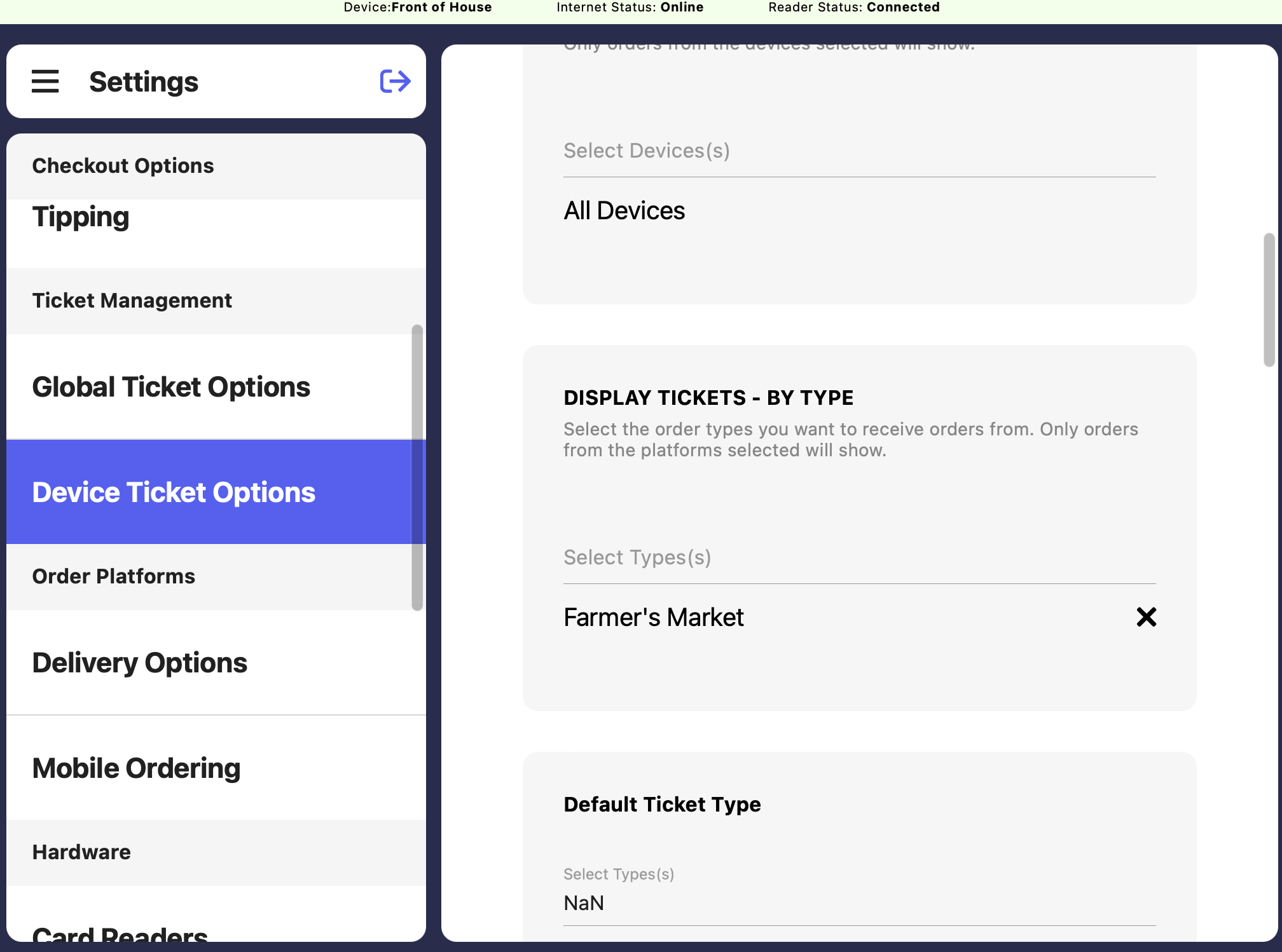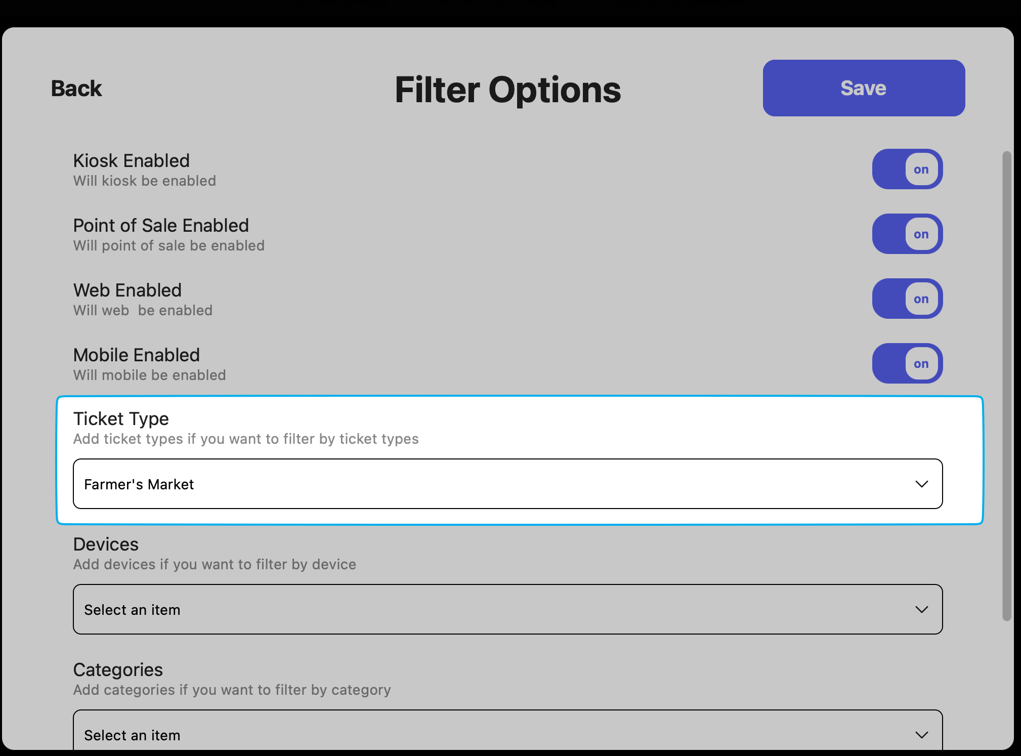 - If the Point of Sale is to include only the DriposGO ticket (i.e., ticket type named Farmers Market) in the ticket screen, filter the device by only the Farmers Market ticket type