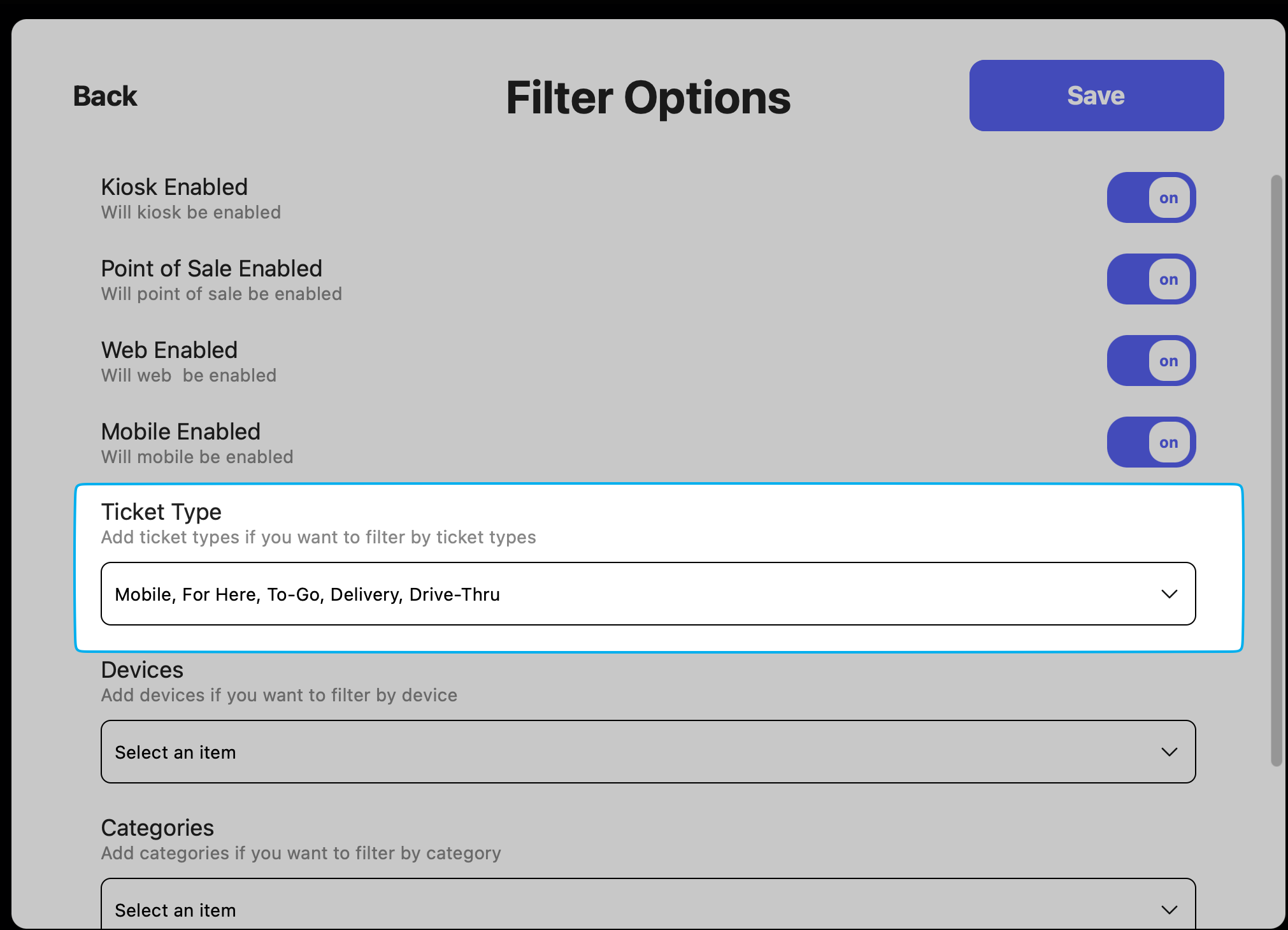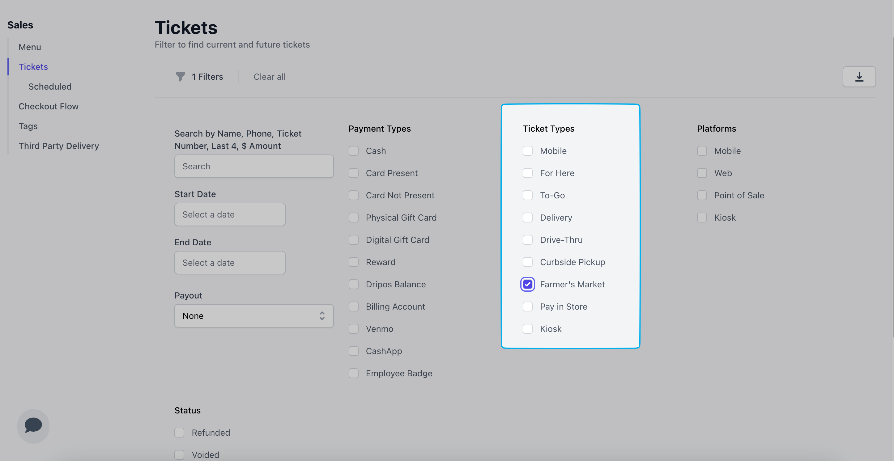 Web DashboardView all Dripos Go transactions on the Web Dashboard > Sales > Ticketse > filter by Ticket Type
