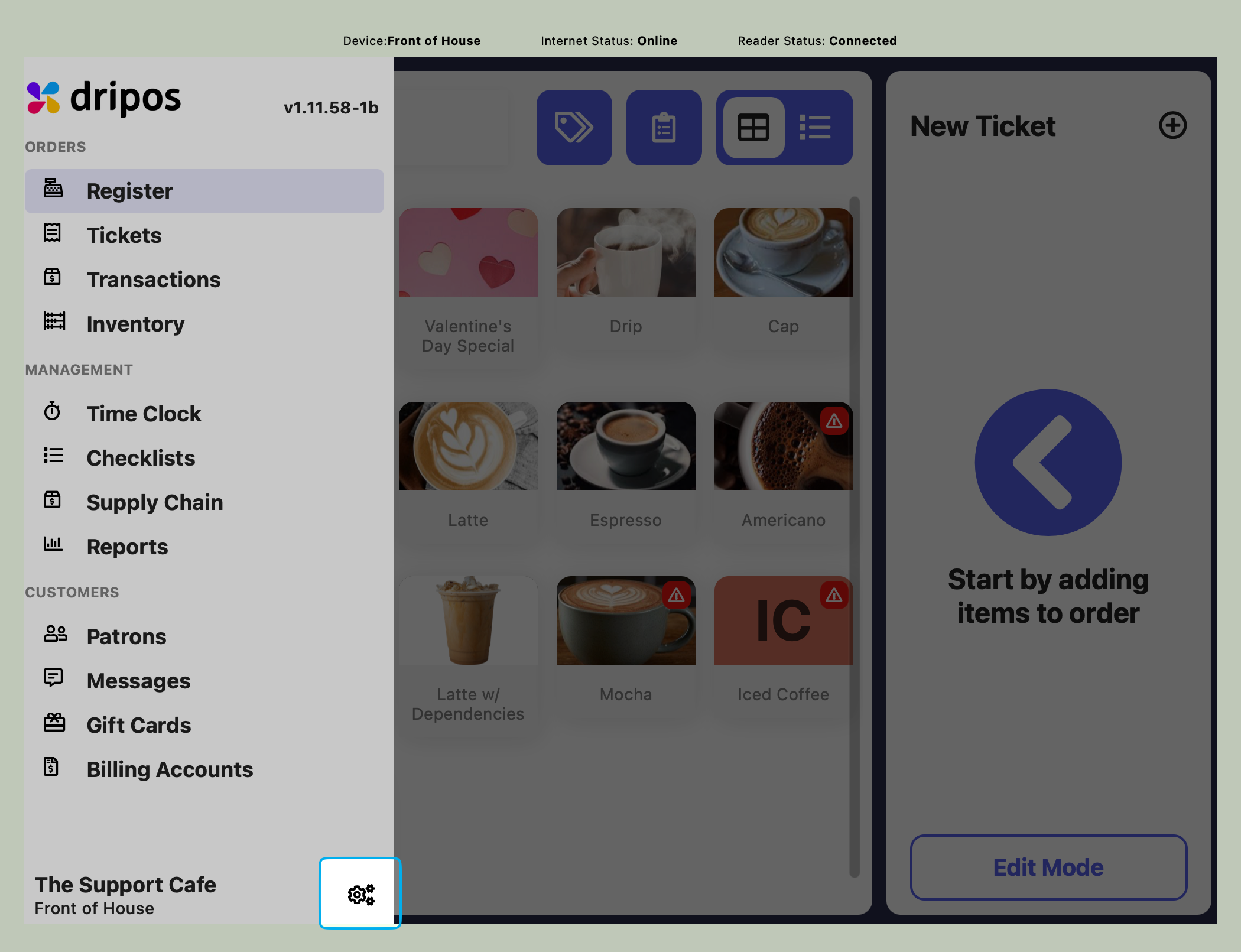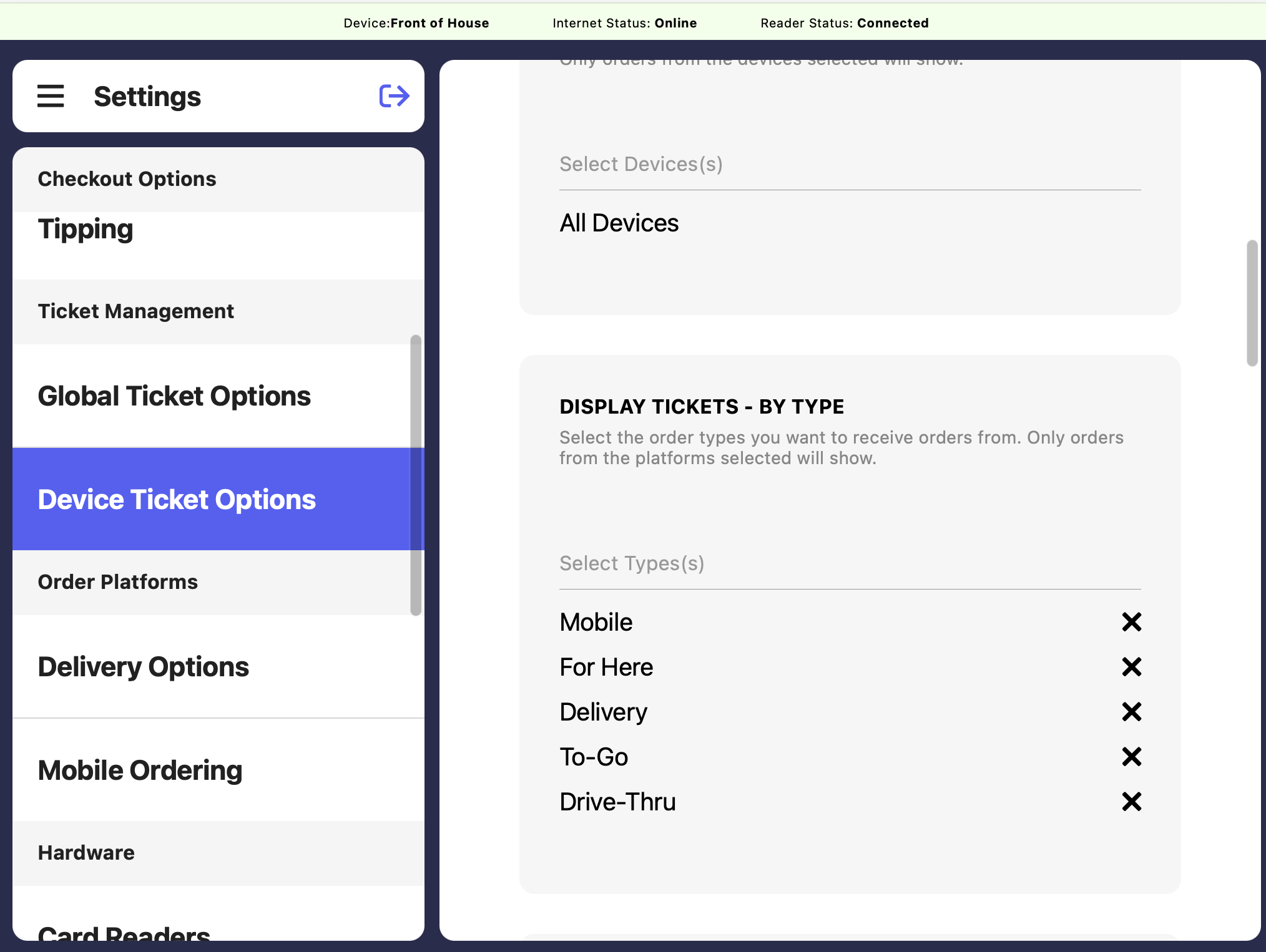 We recommend creating a New Device on your POS App exclusively for Dripos Go. This will allow for option to separate DriposGO tickets from the Point of Sale tickets