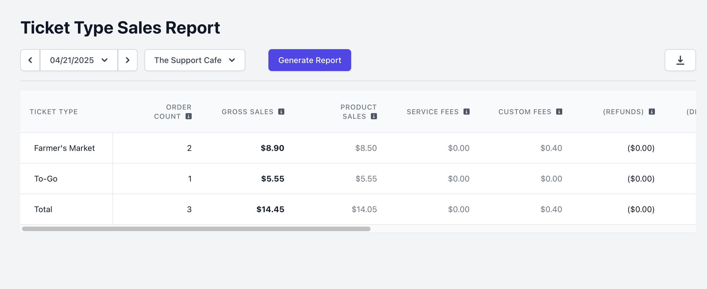 View Dripos Go sales from multiple Dripos ReportsTicket Type Sales Report