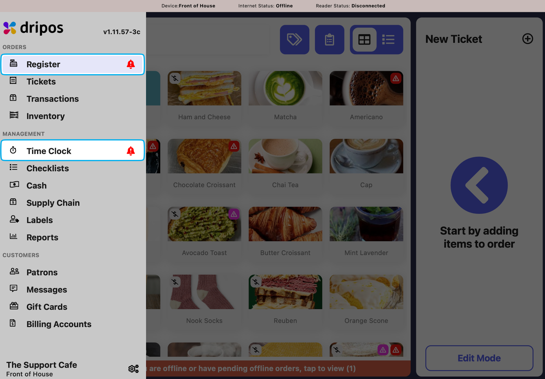 There are several places you can reference to determine if your Dripos Point of Sale device has gone offline: