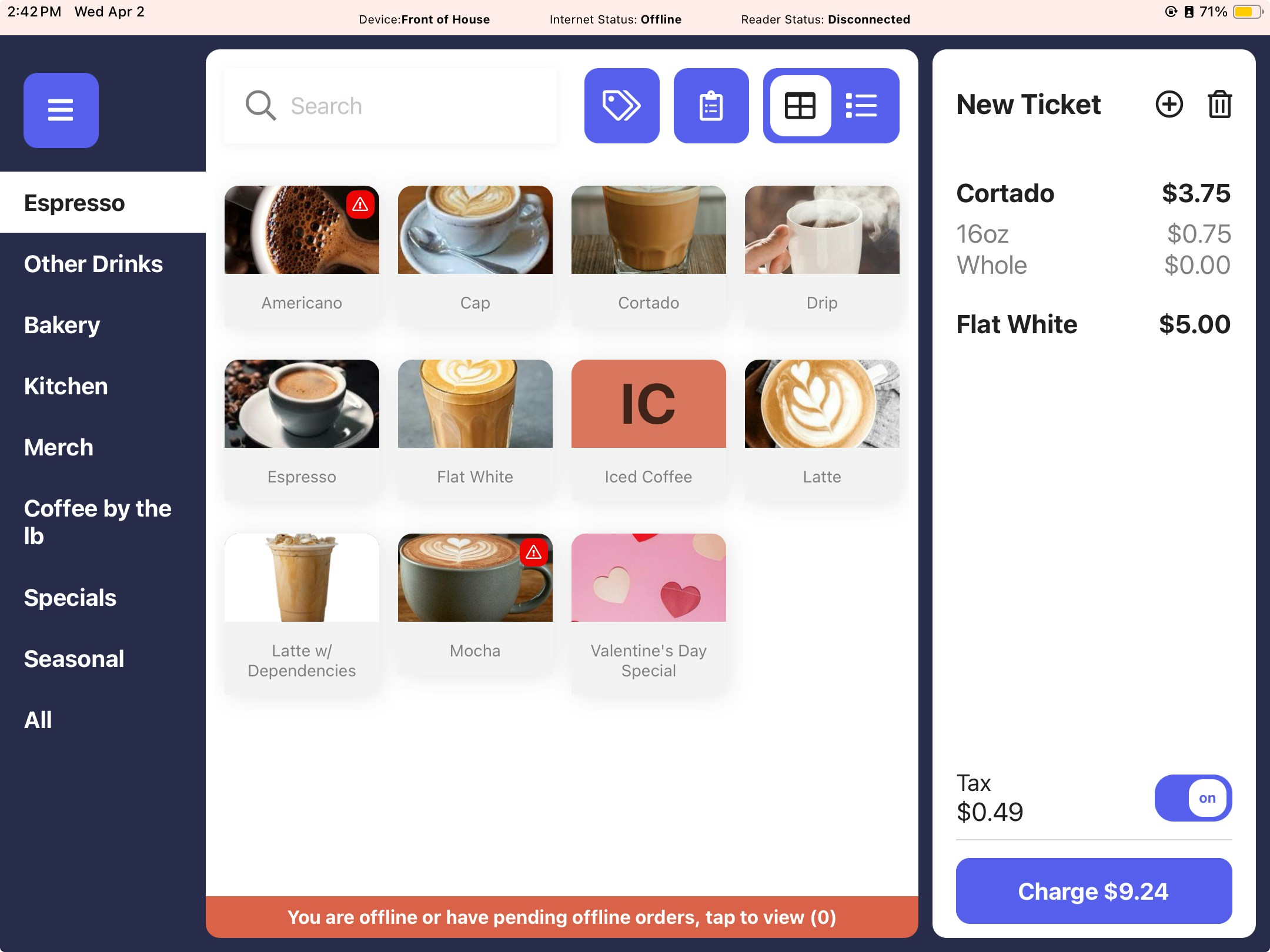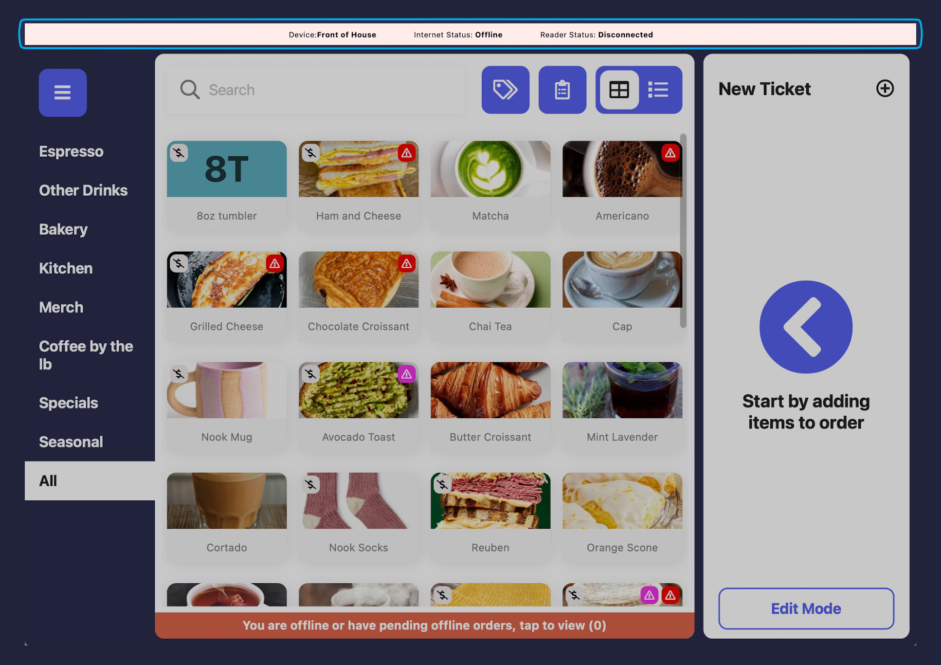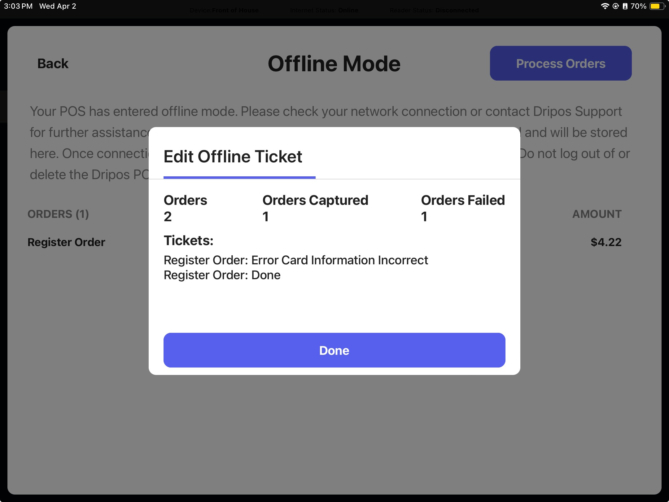 Once the internet is reconnected to the Point of Sale, all offline orders must be processed in order to complete the transaction.