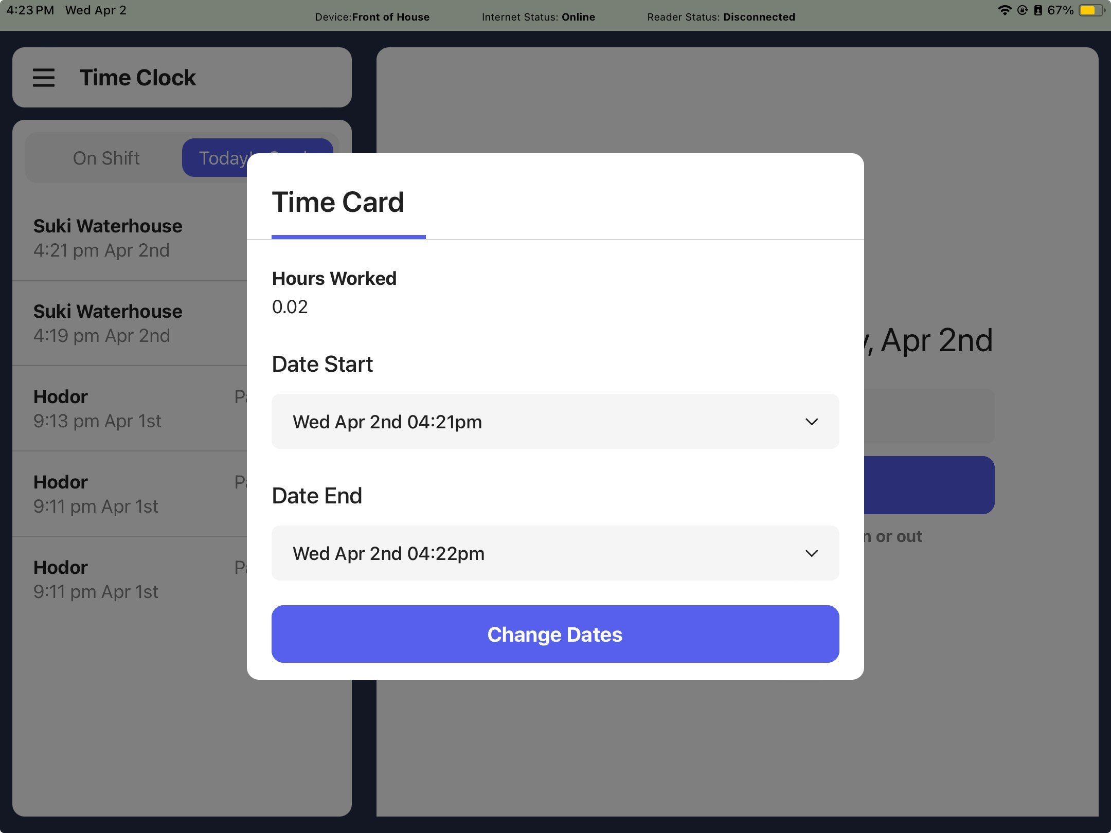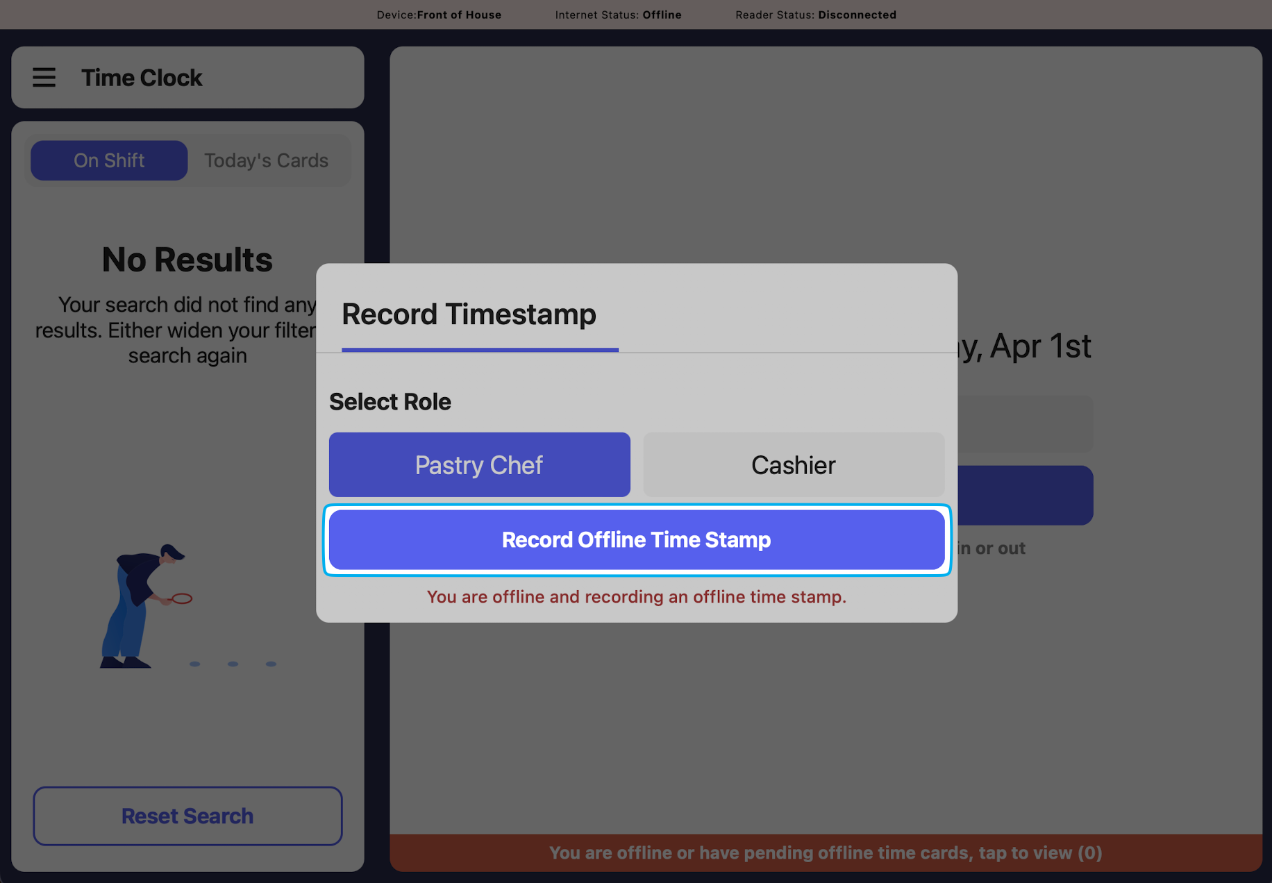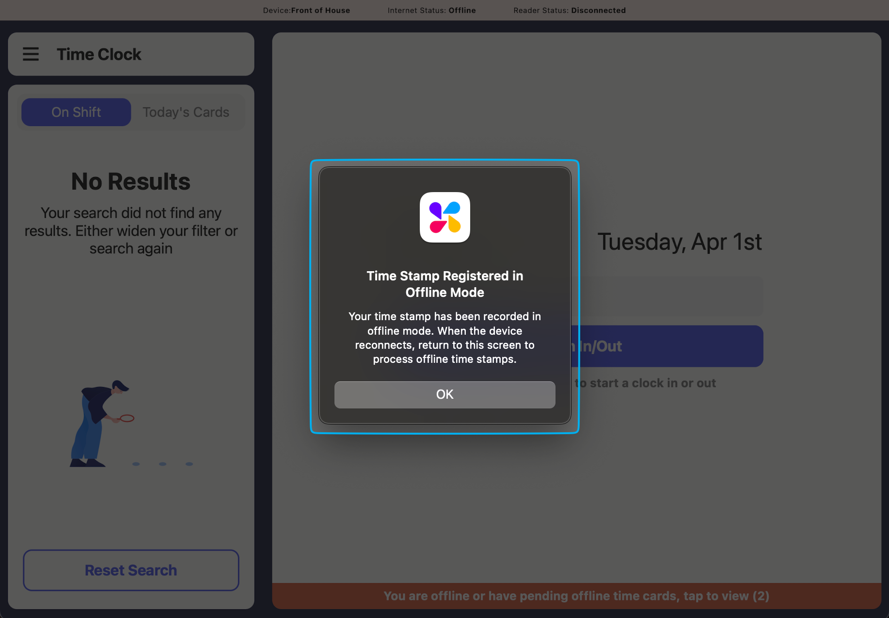 Offline time cards must be processed once the internet is back online.This will additionally ensure that tips earned are attached to time cards.