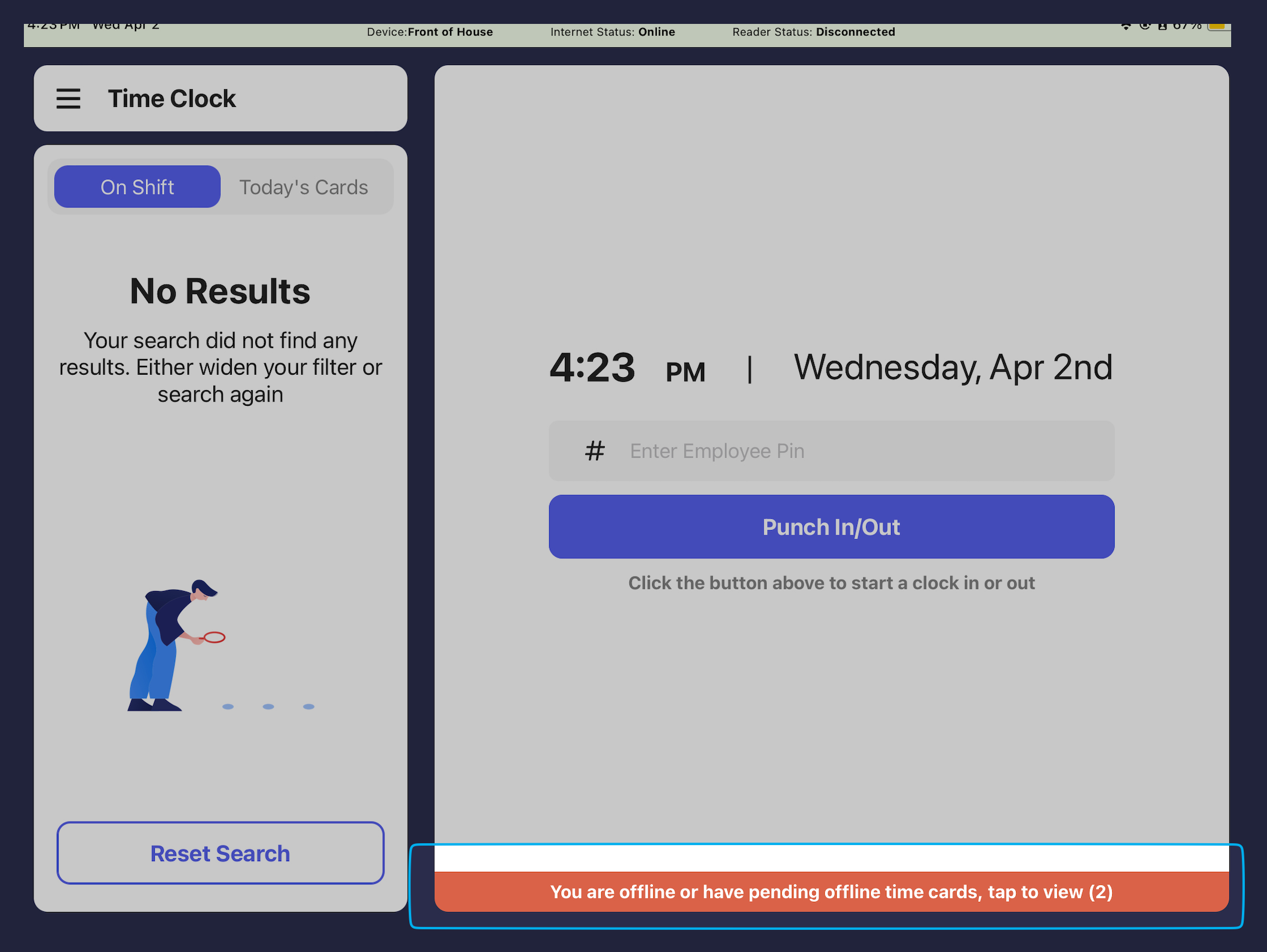 Once the Point of Sale is back online, navigate to Time Cards > press the bottom bar You are offline or have pending offline time cards, tap to view: