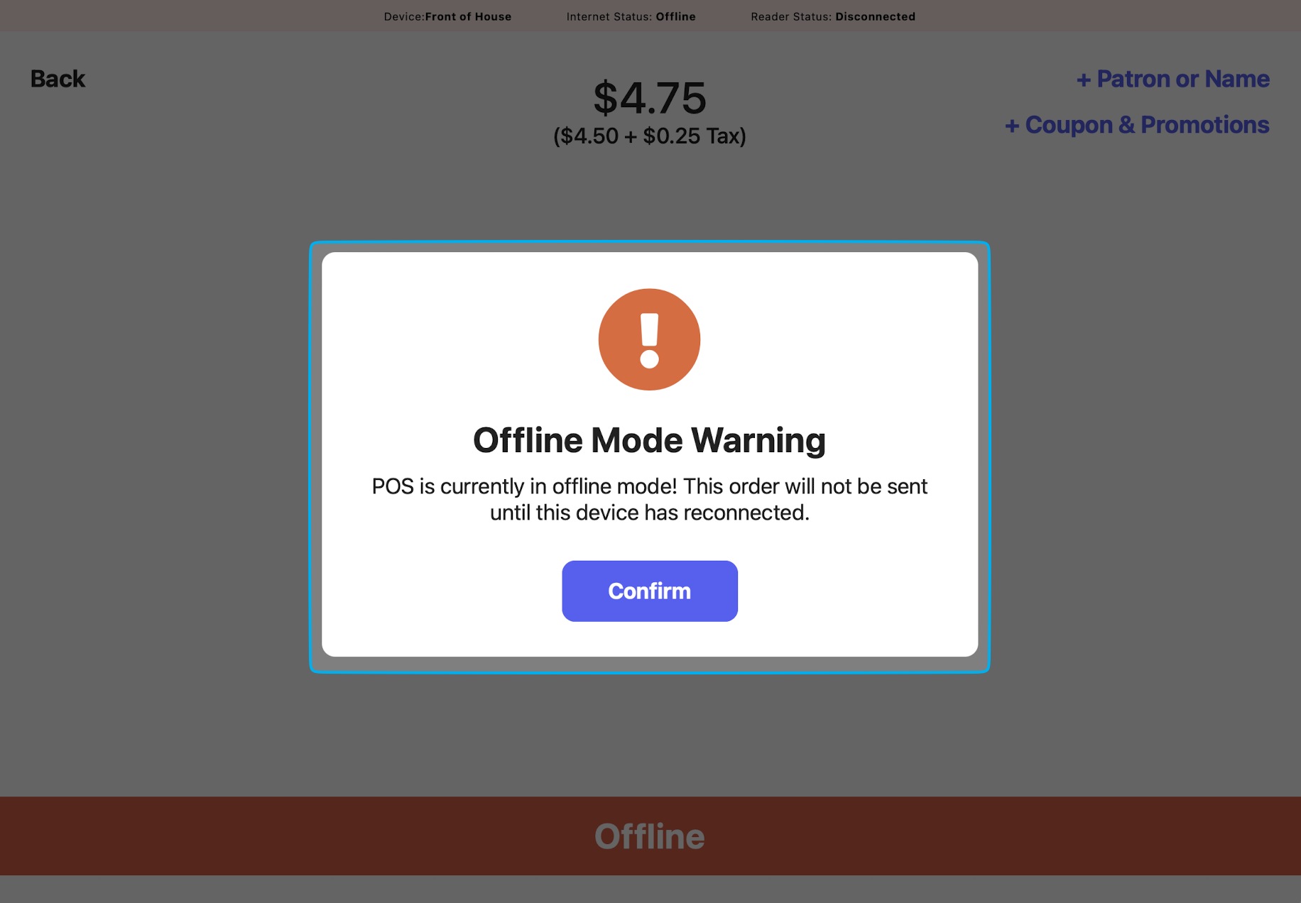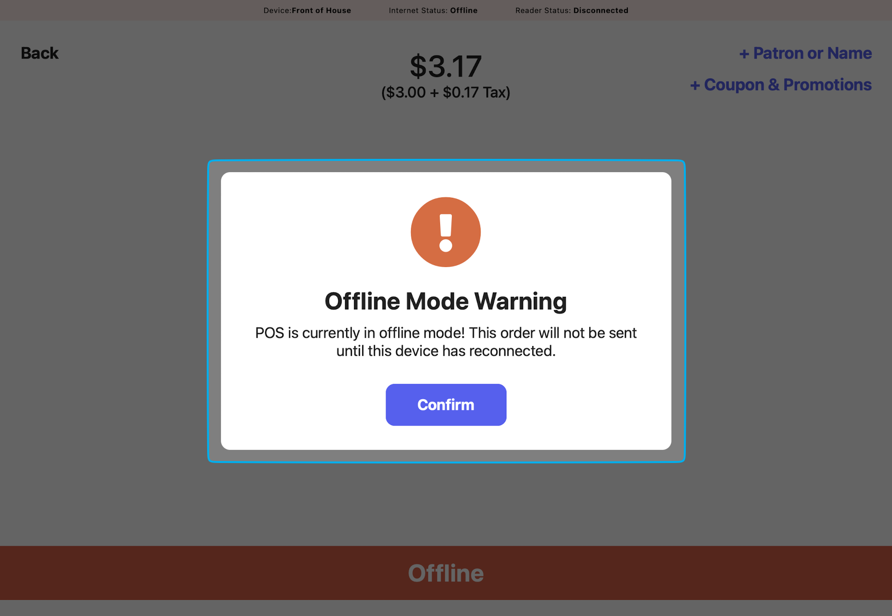 The POS will warn you that you are in offline mode with a pop-up. Press Confirm to proceed.