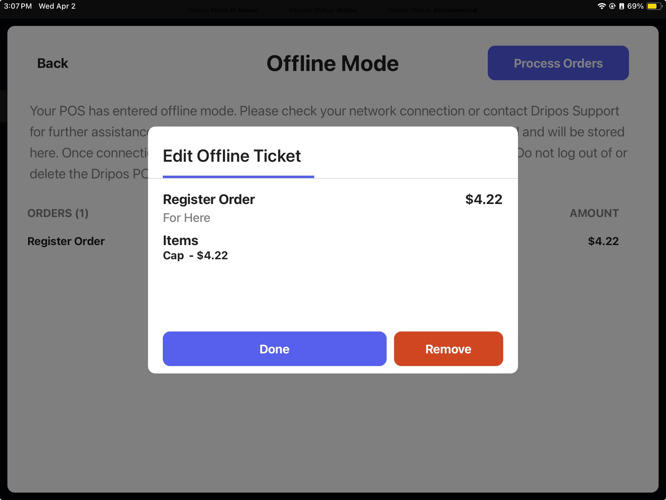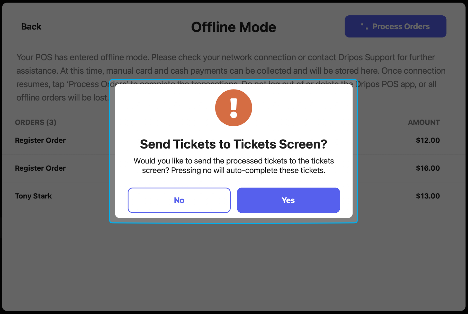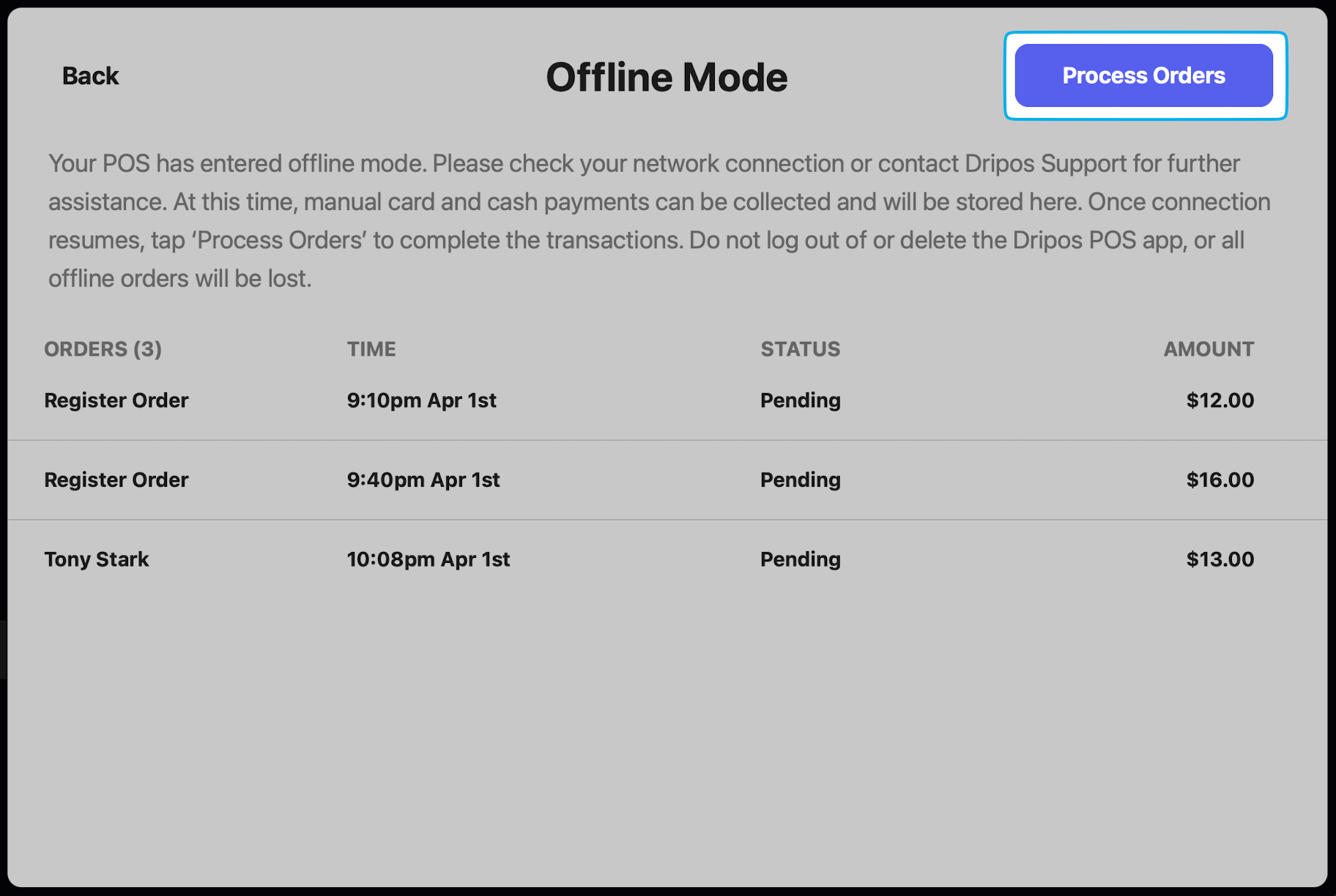This will prompt the offline mode screen to appear, which will display all orders taken offline, as well as the order name, time, status, and amount.Press Process Orders in the top right corner