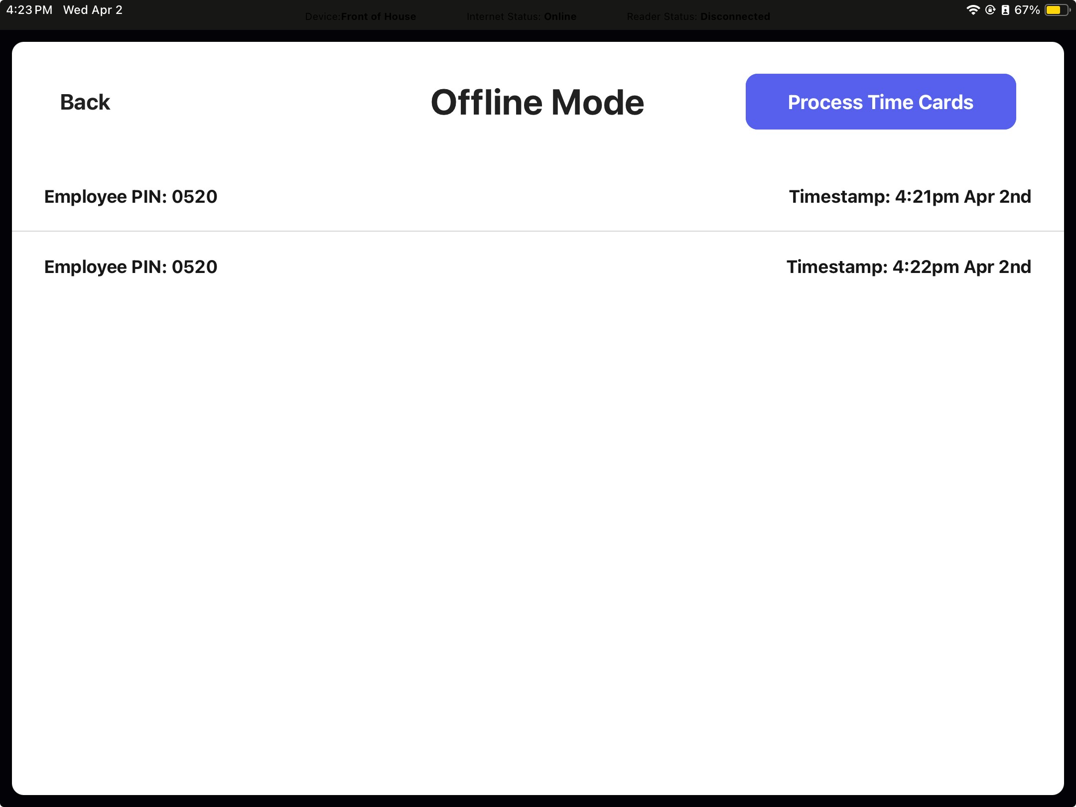 Offline time cards must be processed once the internet is back online. See next steps for how to process these time cards.
